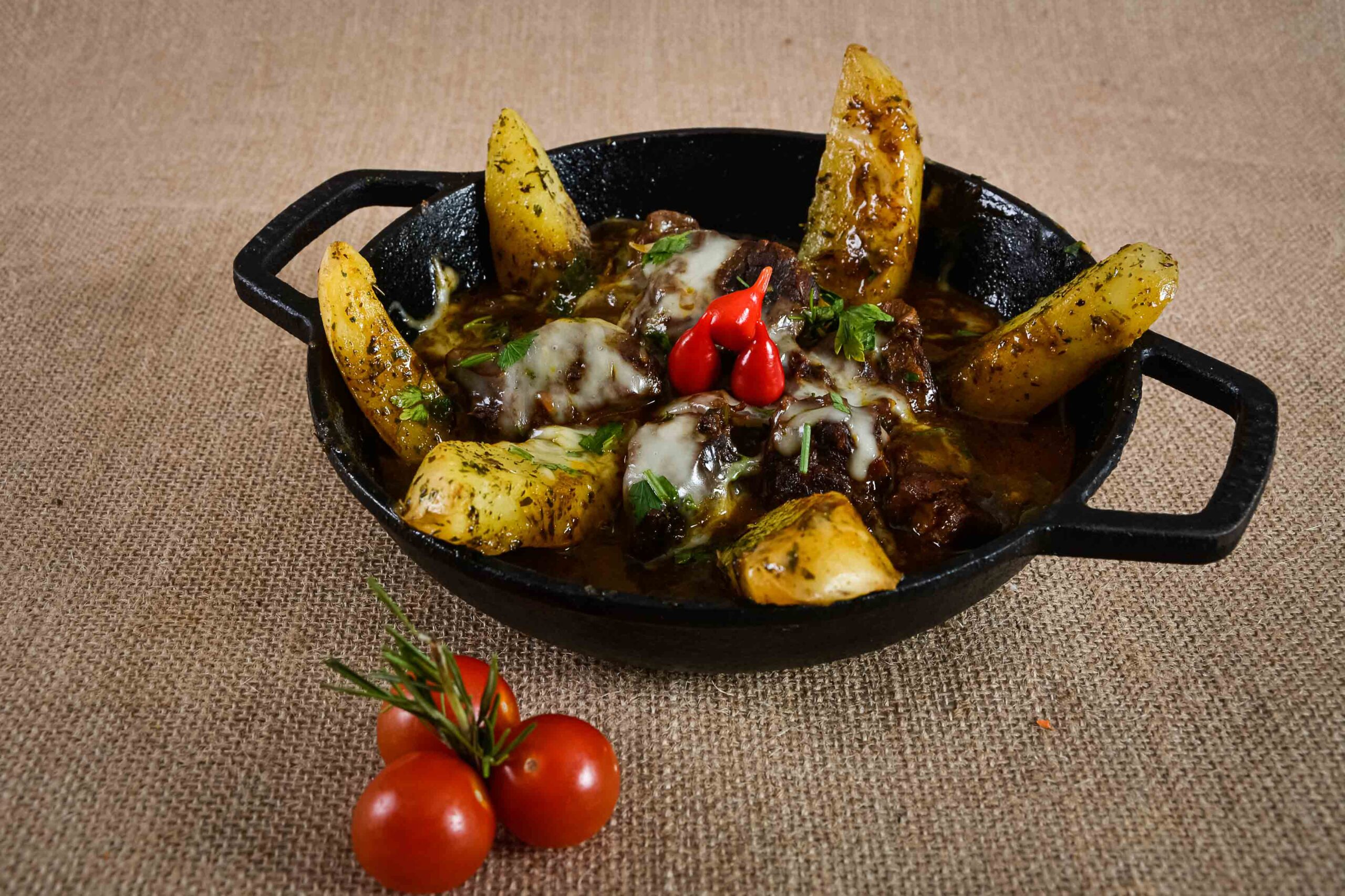 Acém cozido com ervas finas, acompanhado com batata rústica.