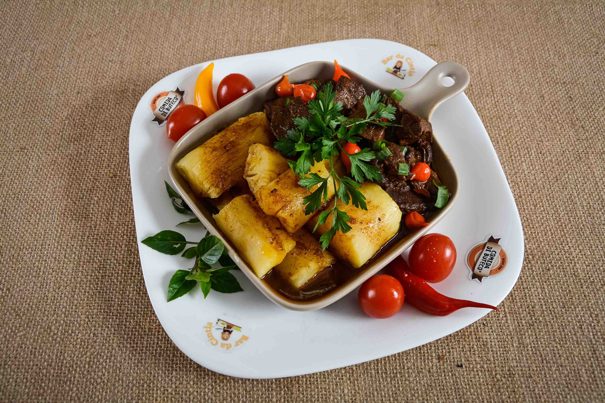 Língua marinada na cerveja Caracu, cheiro-verde, mandioca cozida na manteiga de garrafa.