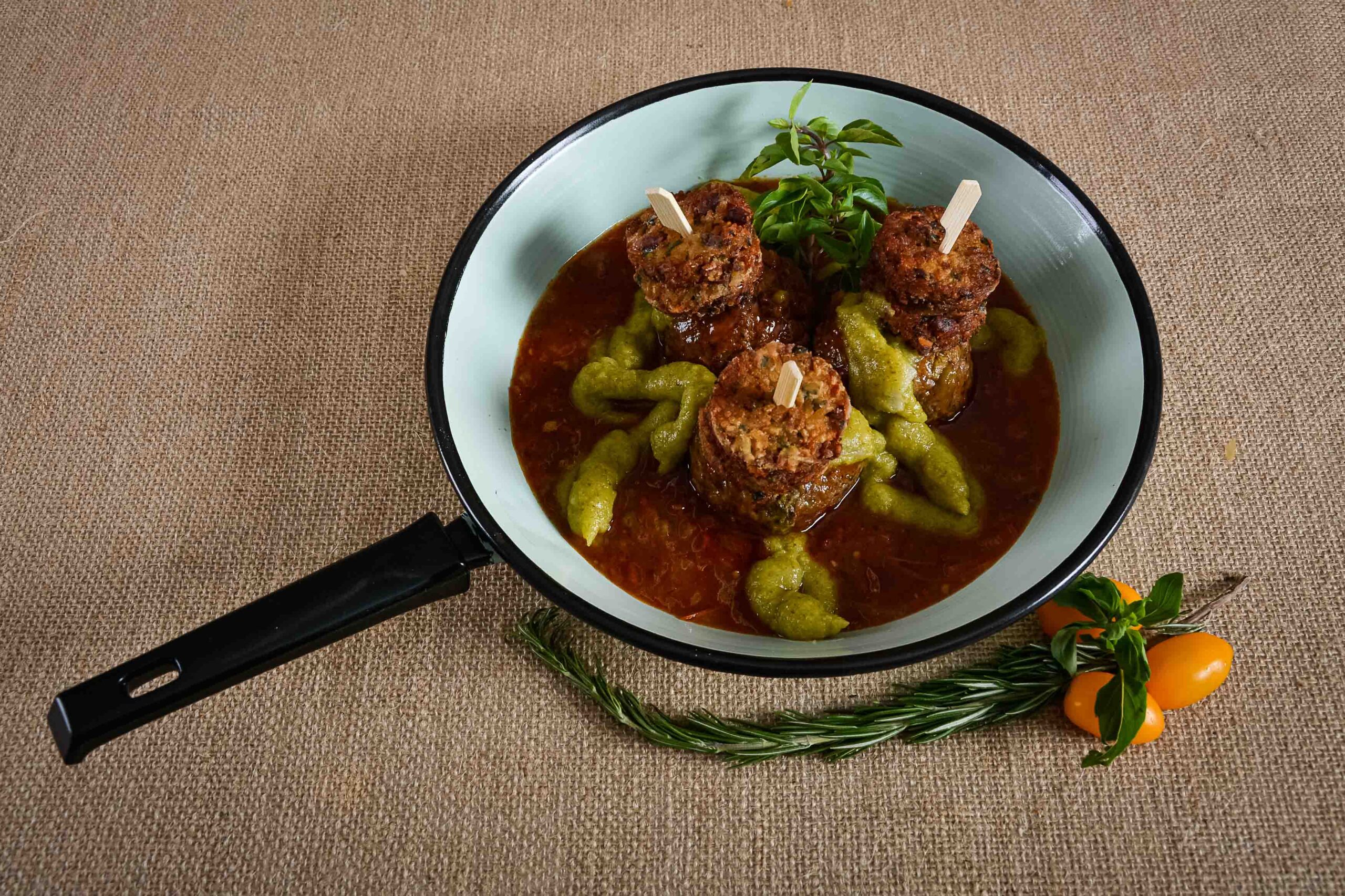 Pelotas de rabada com angu de agrião em molho de tomate com cebola e tipracas (tipo bolachas feitas com arroz, feijão roxinho, queijo e especiarias.)
