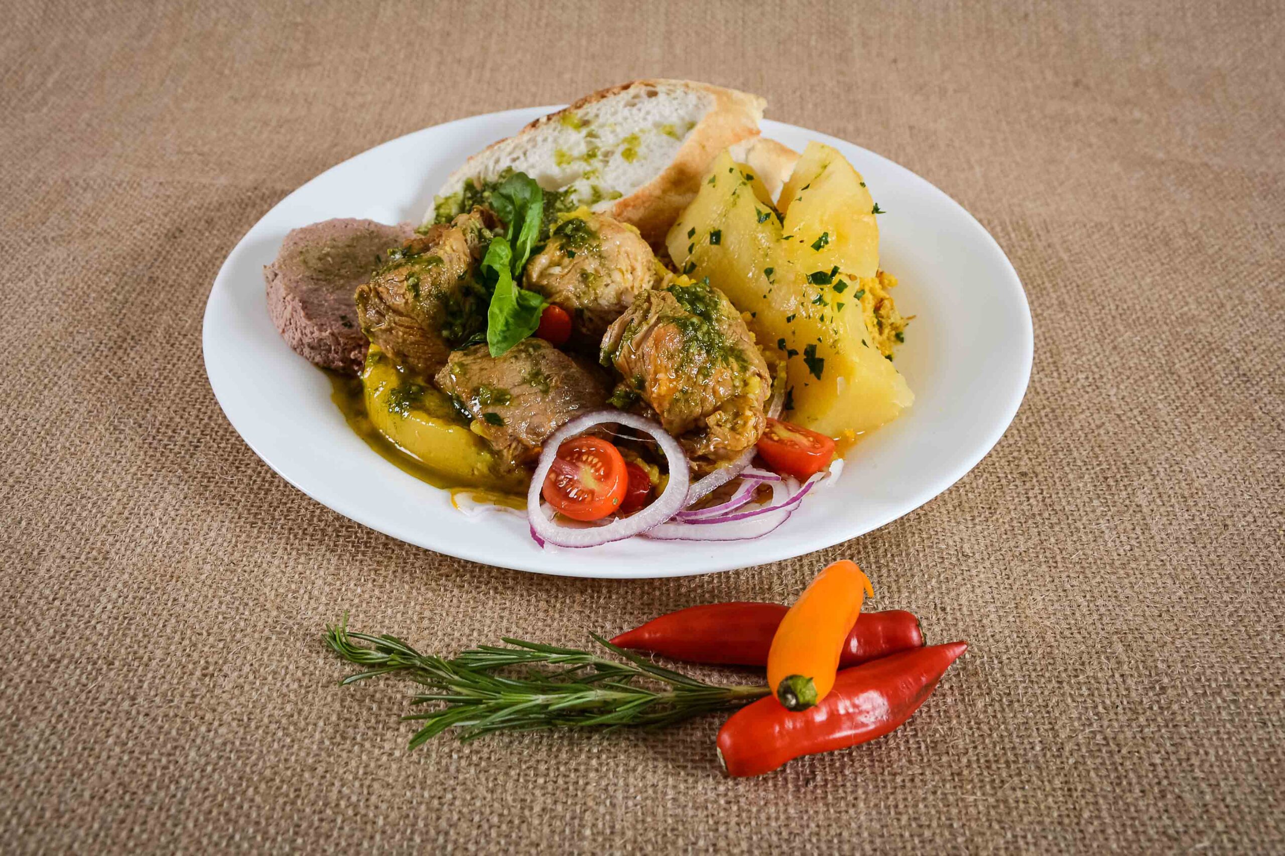 Bochecha de porco na cama de angu mole, pesto de horta, mandioca e agrião. Acompanha pão e patê de fígado de galinha.