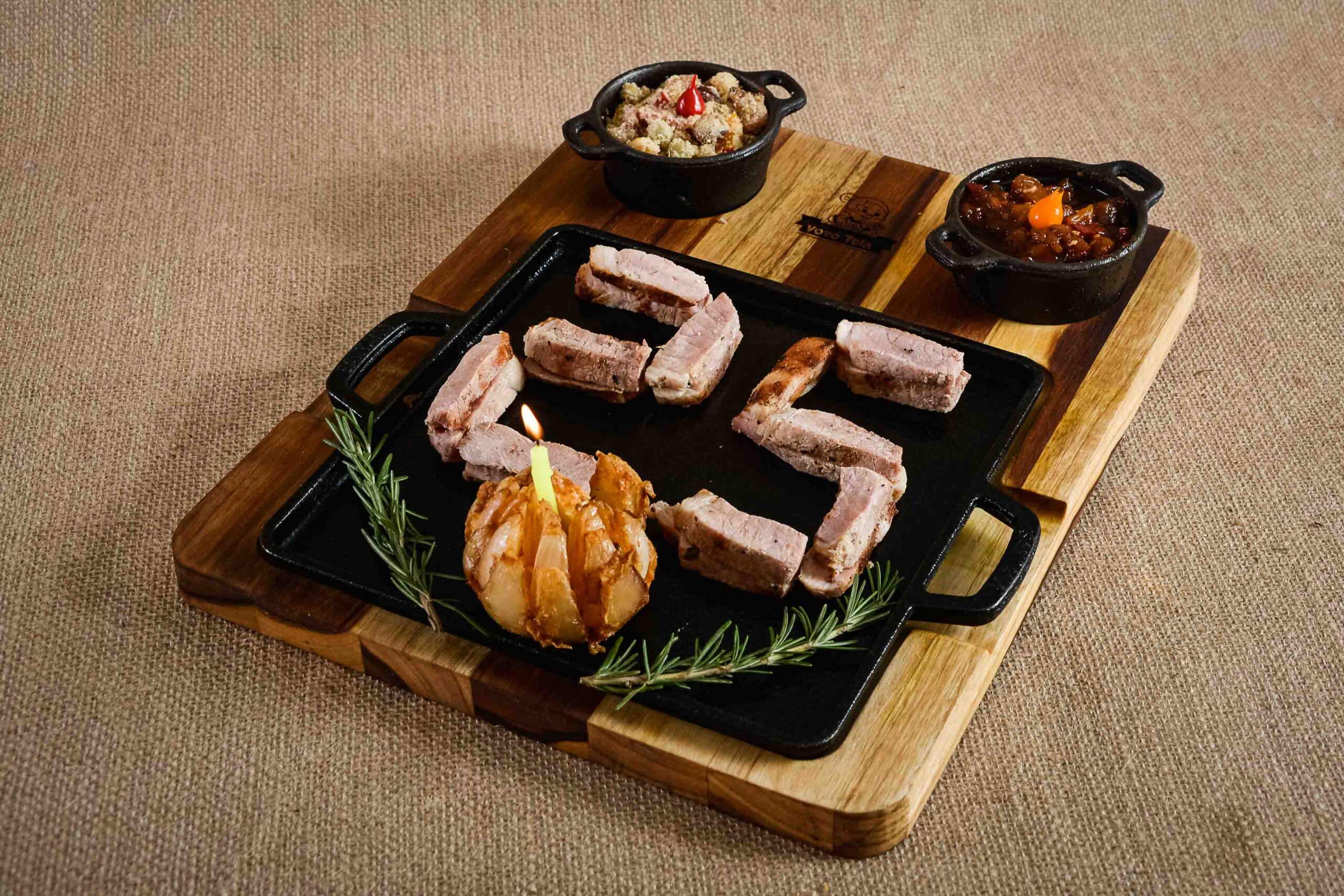 Picanha suína assada, marinada em limão pepper e páprica picante, acompanhada de minicebola empanada, farofa de ervilha e chutney de abacaxi com pimenta-dedo-de-moça.