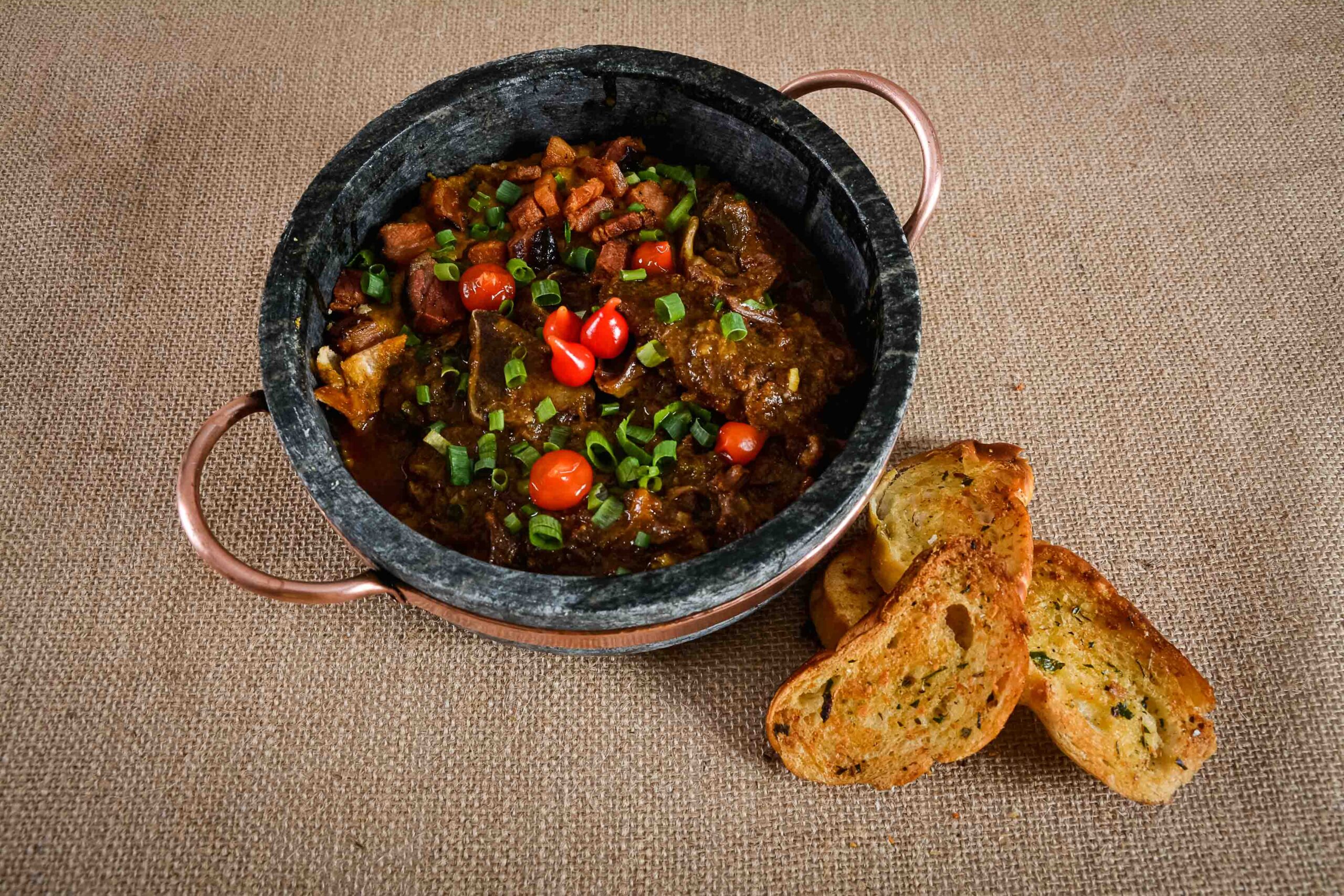 Bisteca bovina, acompanhada de pirão e torradas.