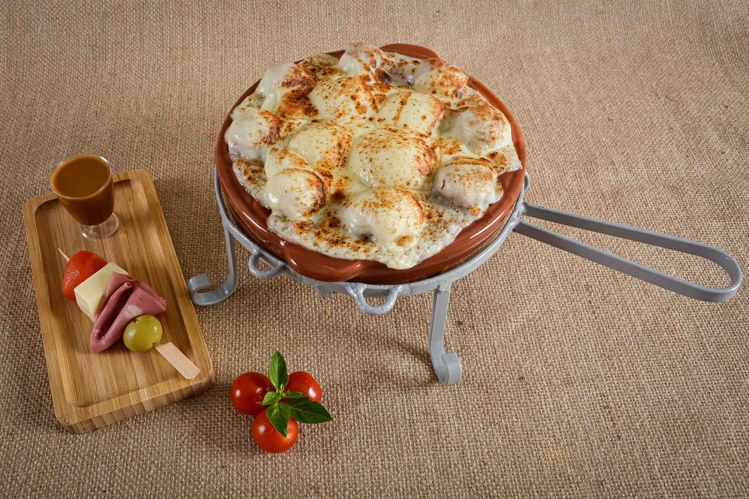 Almôndegas suínas gratinadas com molho de tomate caseiro e muçarela. Acompanha 1 Espetinho de ‘Sacanagem’ e um licor de doce de leite de entrada.