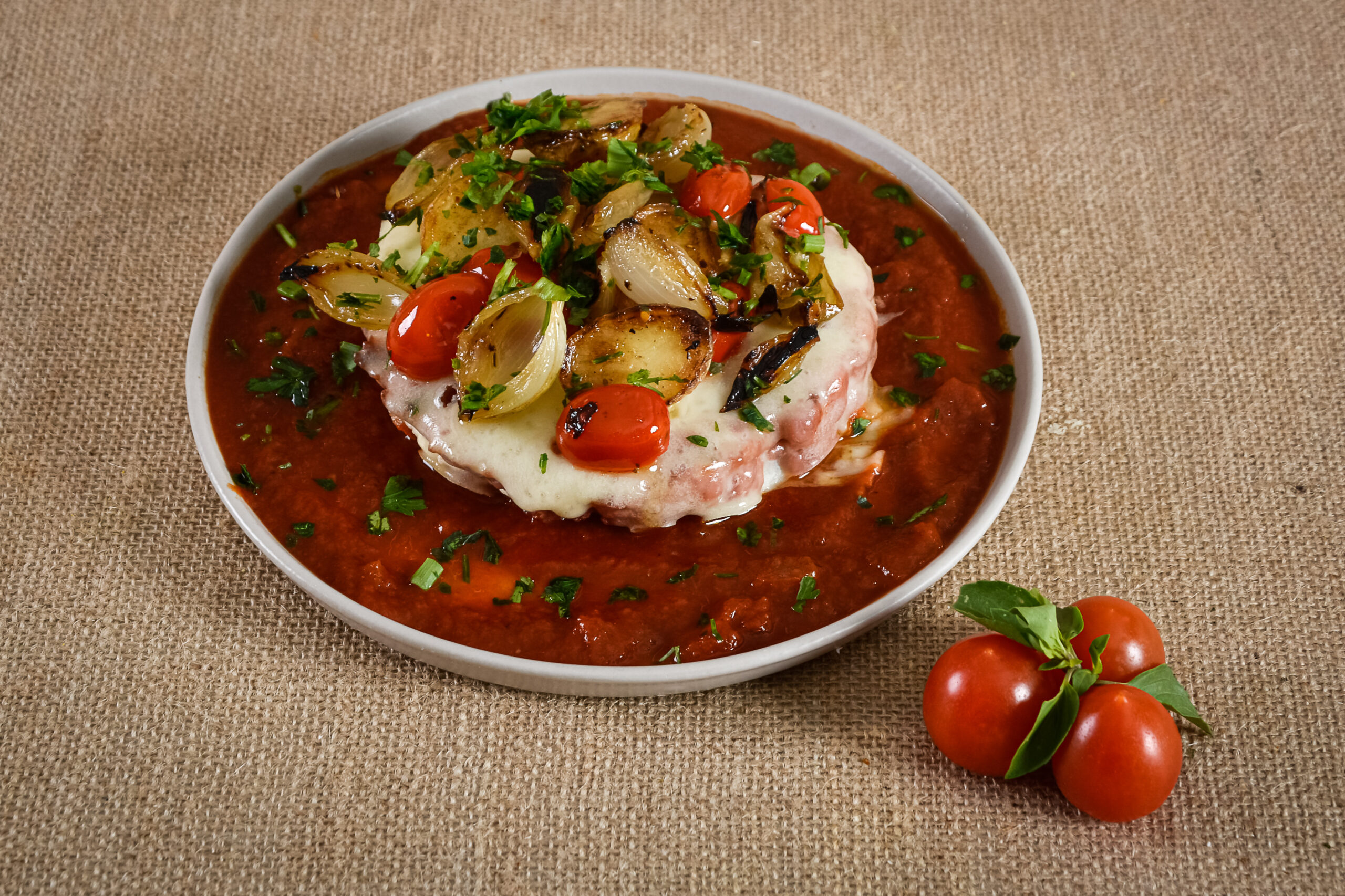 Bolo suíno recheado de queijo, acompanhado de molho de tomate, cobertura de muçarela e “confetes” de tomate, batatinha e cebola assadas.