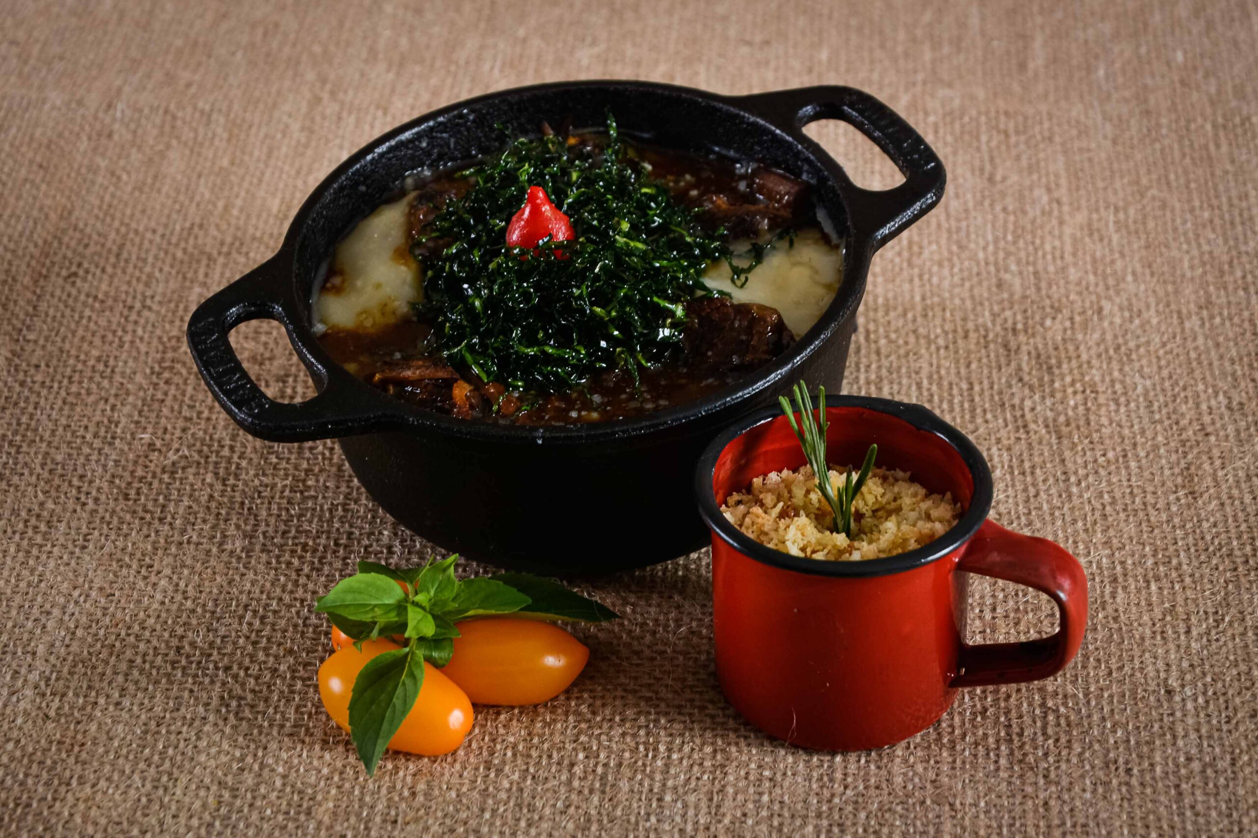 Carne bovina cozida na panela de pressão e reduzida no molho à base demi glace. Acompanha nosso creme de mandioca caseira, farofa crocante de panko e crispy de couve.