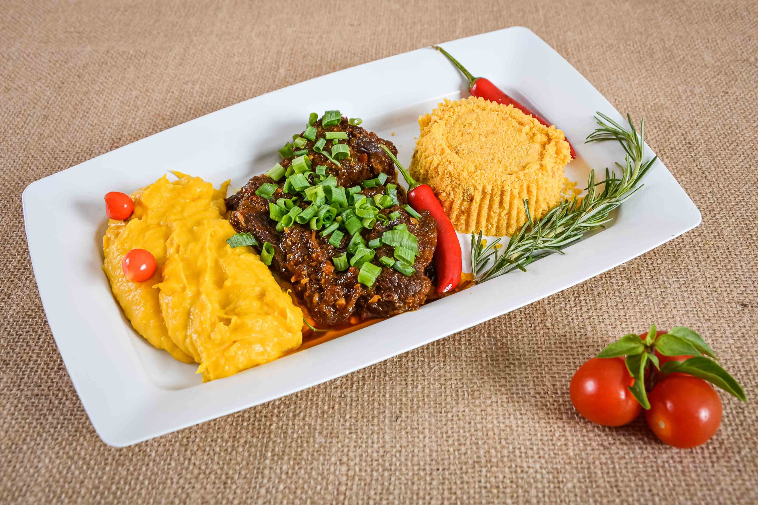 Maçã de peito acompanhada de purê de moranga e farofa da casa.