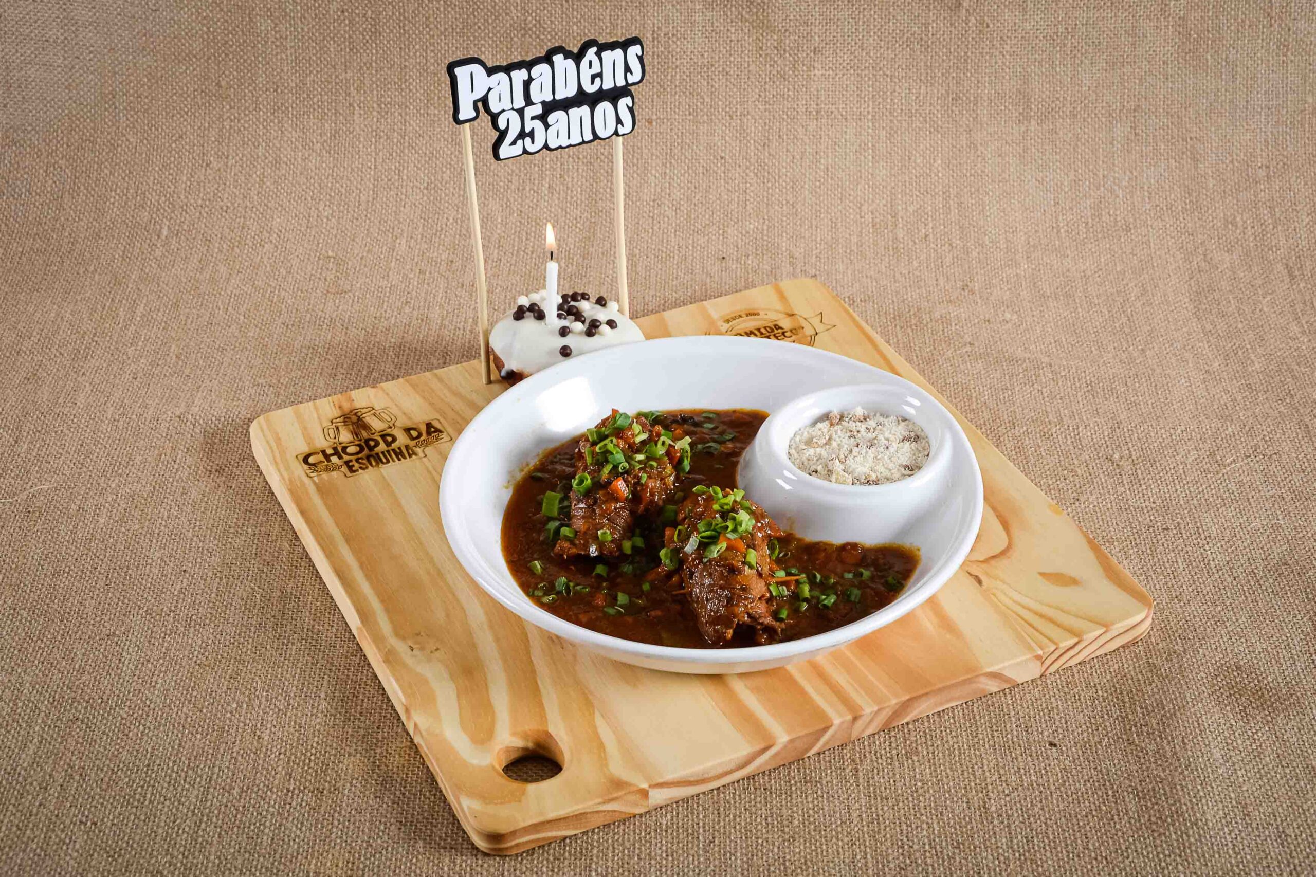 Bife a rolê, acompanha farofa de torresmo.