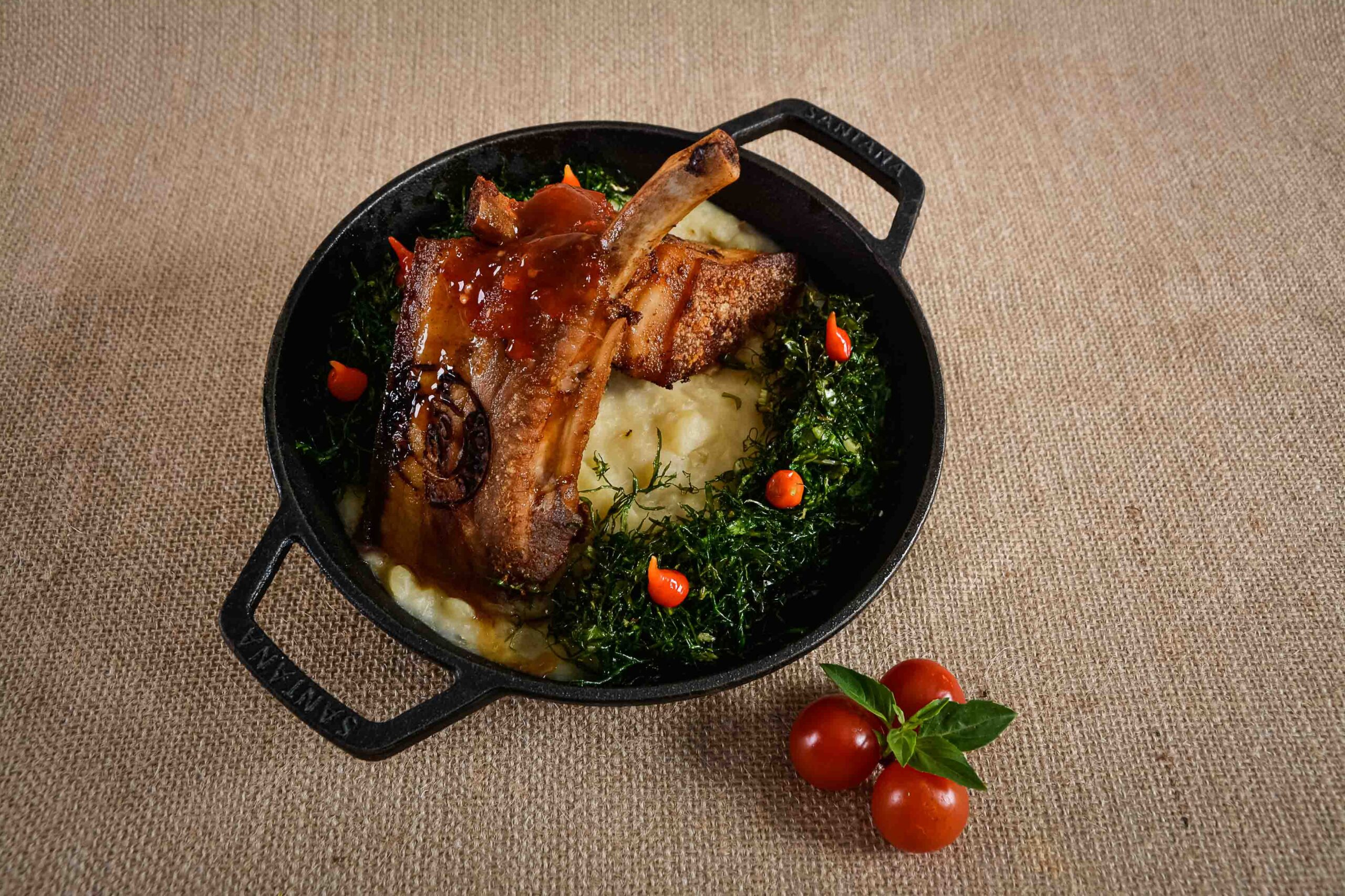 Picolé Mineiro – Costelinha suína com pele e osso. Acompanhada de purê de mandioca e crispy de couve.