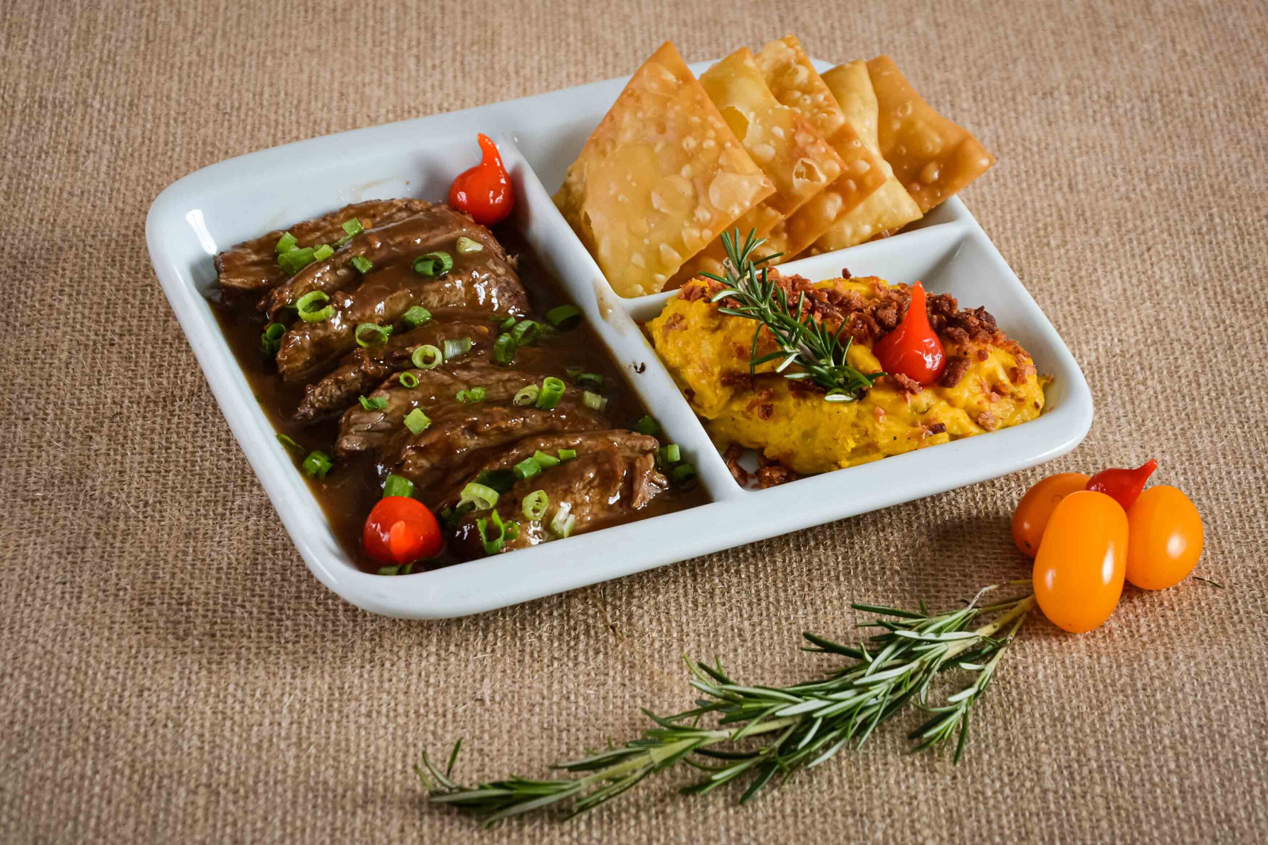 Maminha cozida marinada no vinho tinto, servida com molho madeira, acompanhada de purê de abóbora moranga com bacon frito triturado e chips de massa de lasanha.