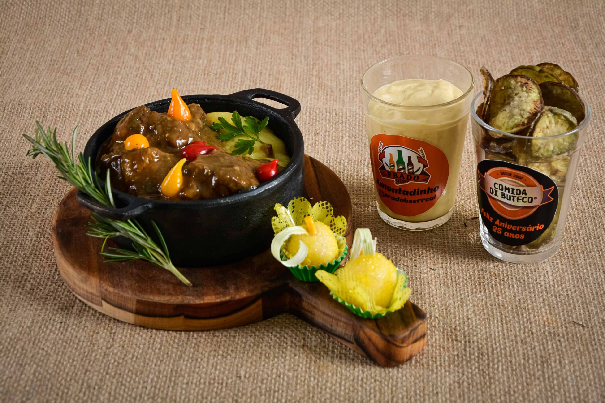 Angu com carne de panela, chips de jiló e molho à base de milho e cachaça.