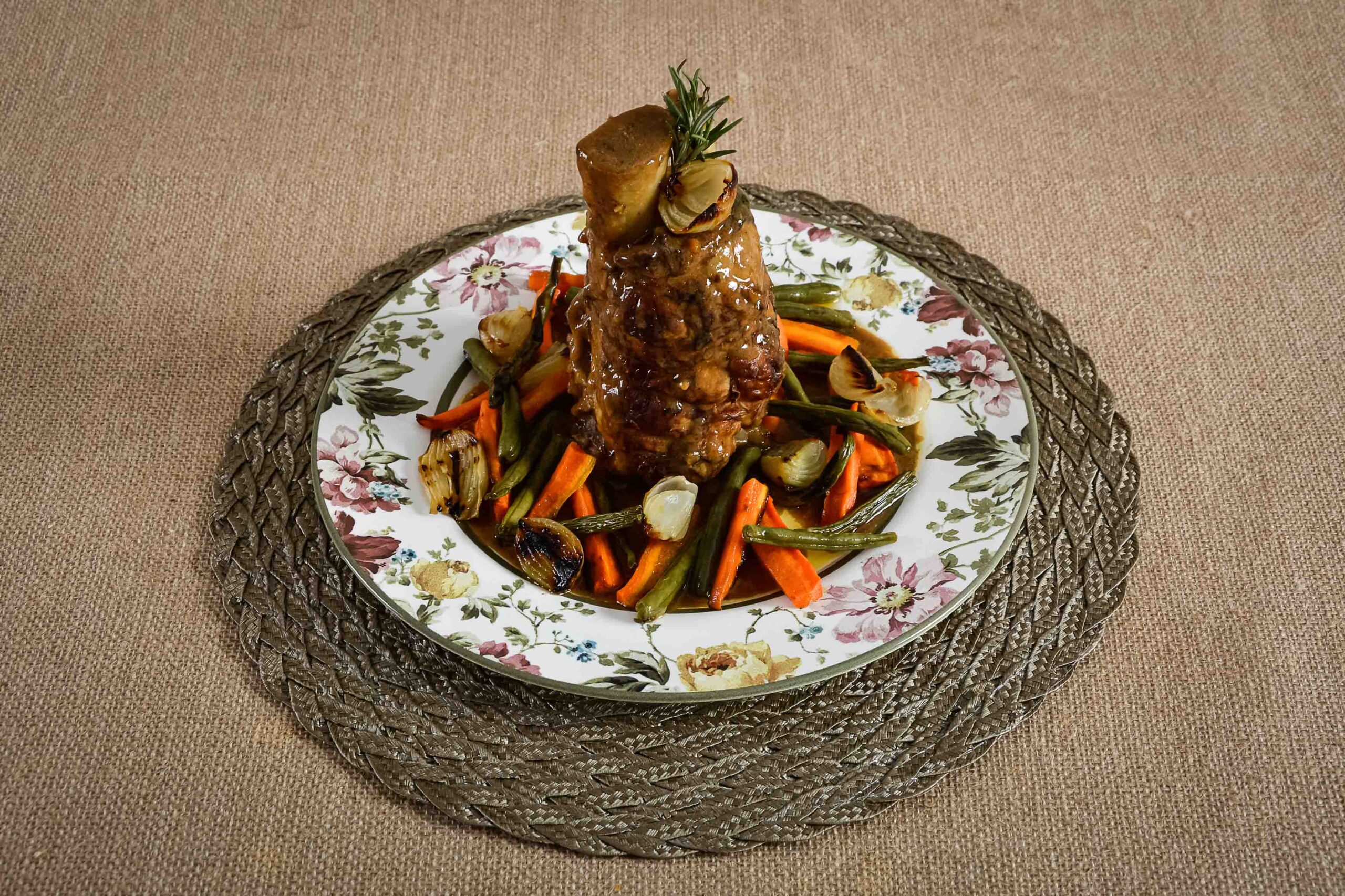 Panturrilha suína no seu molho com legumes grelhados.
