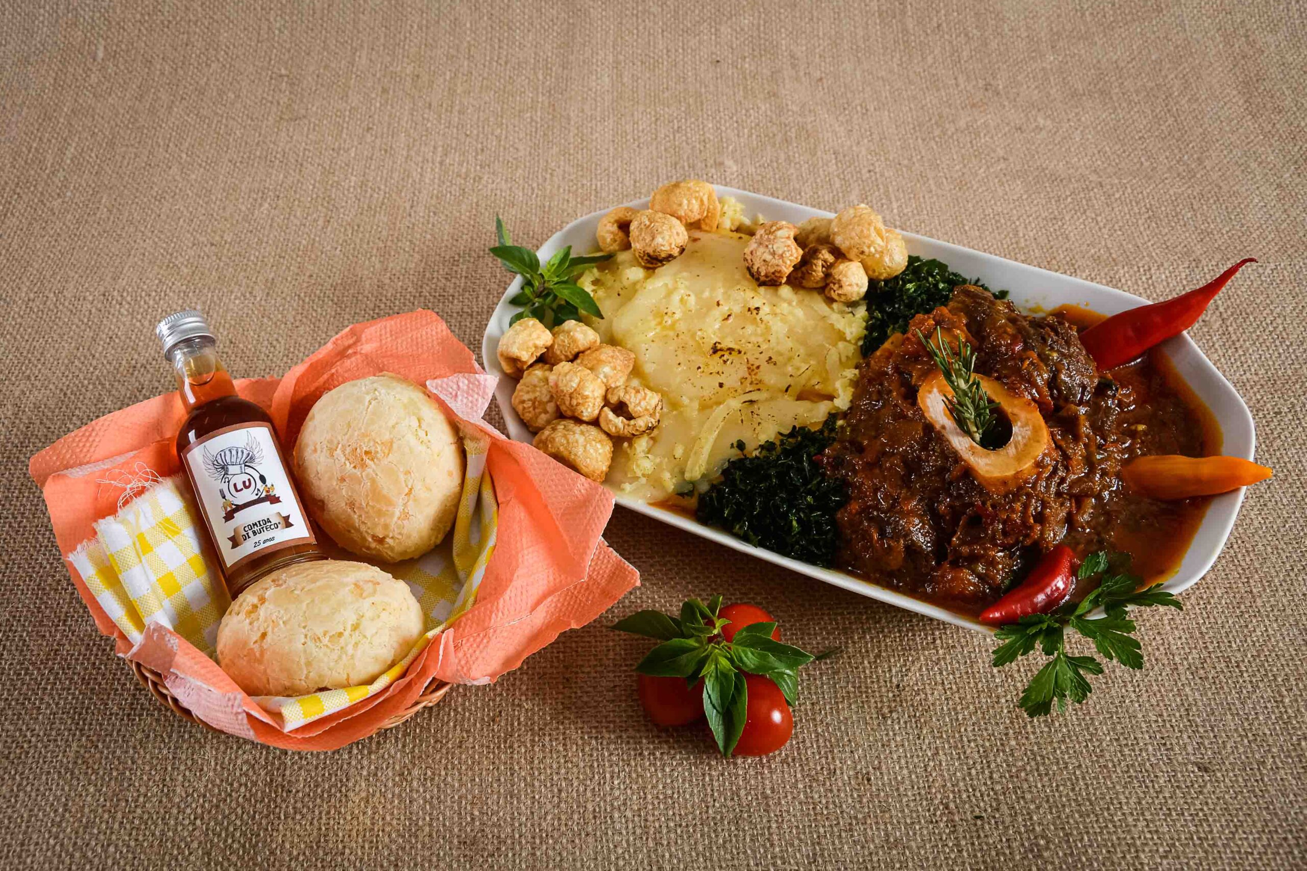 Ossobuco marinado com ervas finas e vinho tinto, acompanhado de polenta coberta com queijo parmesão e muçarela gratinada, crispy de mostarda e torresminho pururuca.
