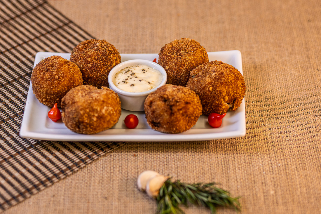 Bolinho de guisado e queijo, empanados com batata-doce. Acompanha maionese da casa.