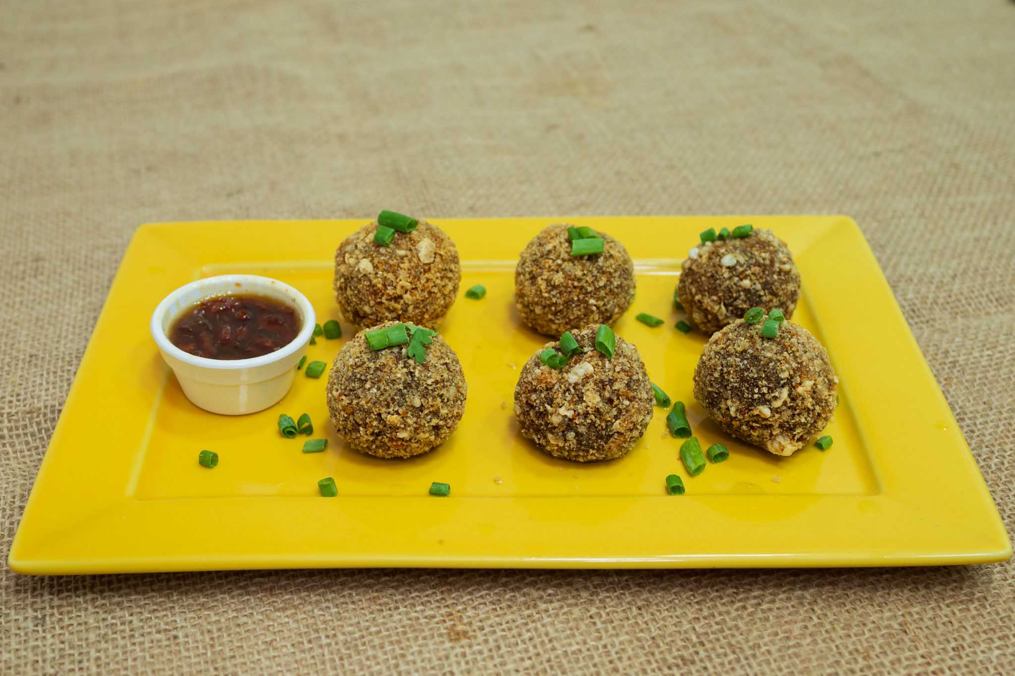Bolinho feito a partir da feijoada da casa. Acompanha um chutney de bacon, laranja, pimenta e gengibre.