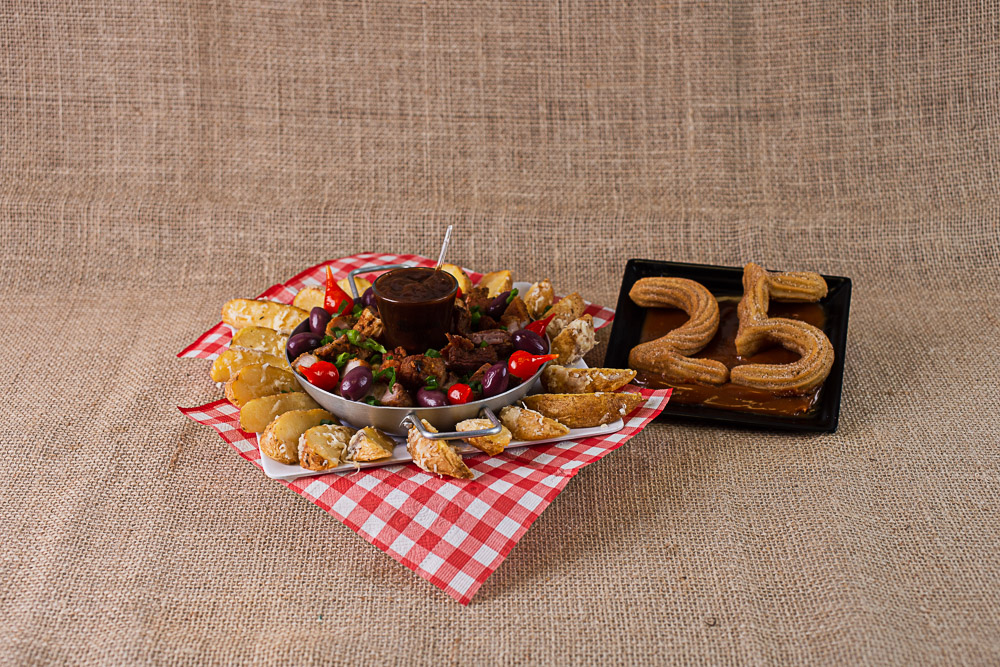 Costelinha de porco sem osso, servida no tempero especial da casa, acompanha barbecue artesanal, com batatas rústicas empanadas com queijo parmesão e churros em formato de 25 servidos com doce de leite argentino.