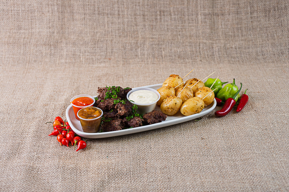 Espetinhos de kafta de costela desconstruídos. Acompanha: salada de batata com casca, molho de pimenta, molho de queijo, chutney de manga.