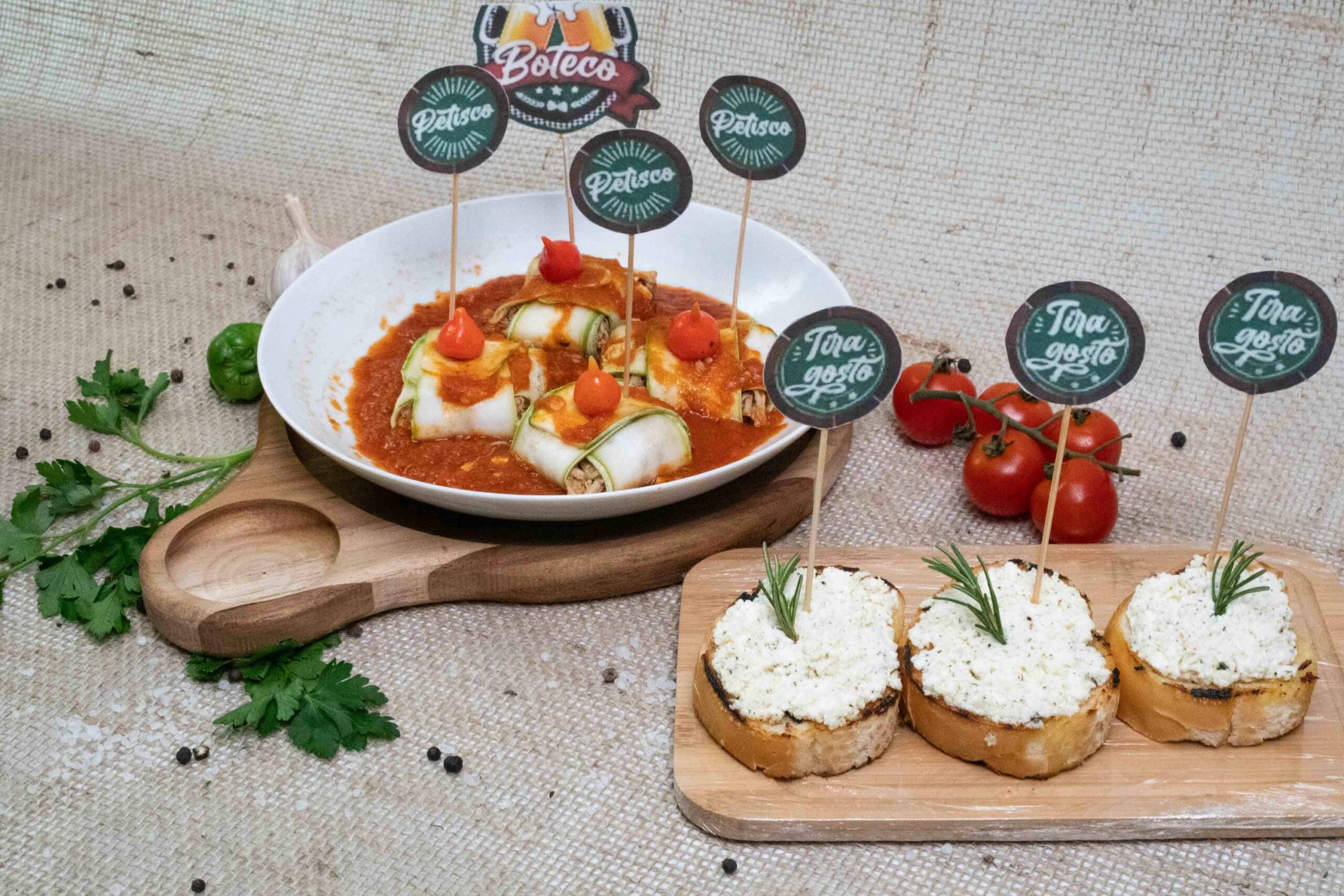 Trouxinhas de abobrinha recheadas com pernil e finalizadas com pimenta-biquinho. Acompanha torradas com patê de ricota.