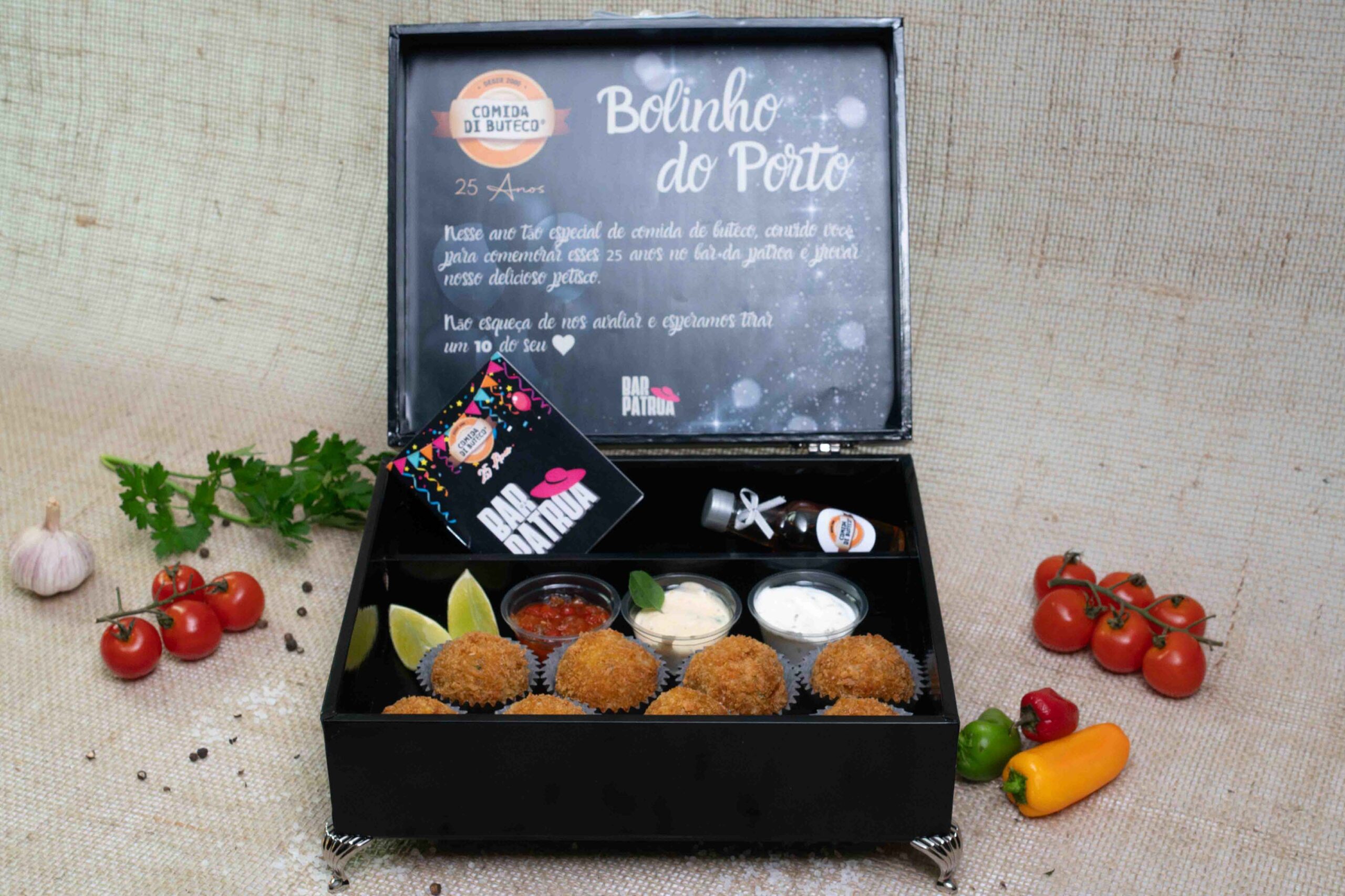 Bolinho de bacalhau do Porto com a massa de cabotiá recheada com queijo muçarela. Acompanha molho de alho, vinagrete de pimenta e molho tártaro.