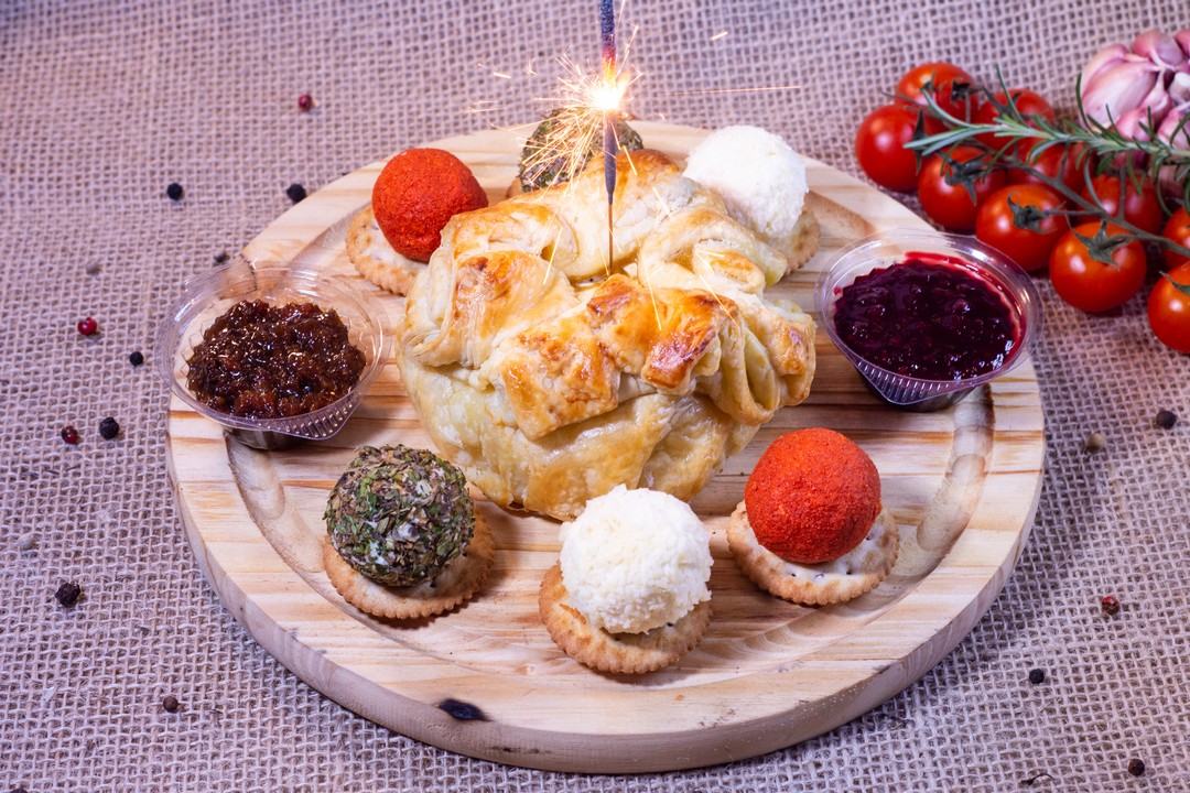 Queijo brie folhado, com geleia de bacon e geleia de amora, com brigadeiros de queijo saborizados.