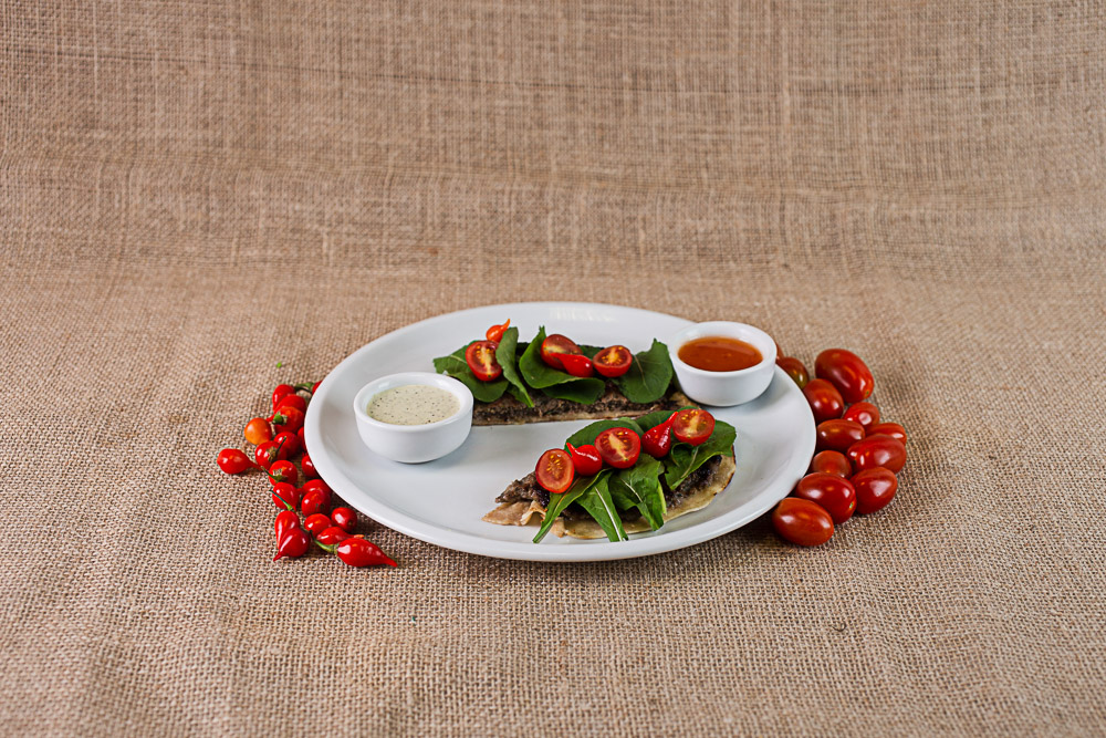Kafta de carneiro, com salada fresca de rúcula no pão sírio. Acompanha molho de hortelã.