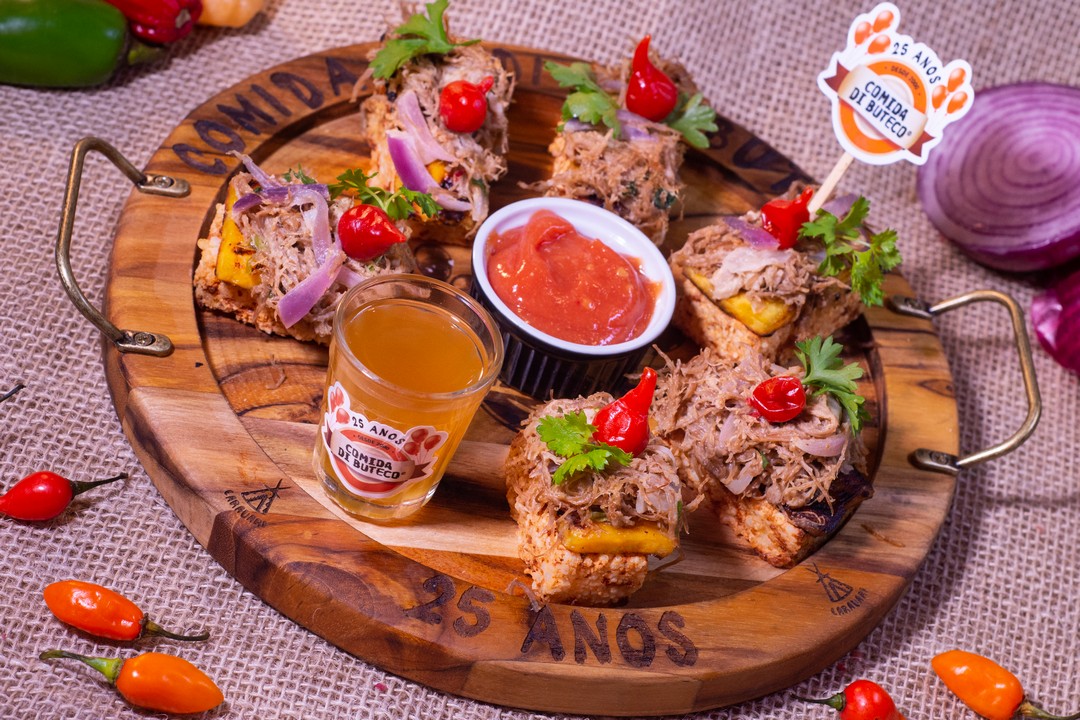 Bastões de tapioca com carne de sol na nata, puxados na manteiga de garrafa com banana-da-terra grelhada, servidos com geleia de goiaba com pimenta. Acompanha um shot de cachaça de rapadura.