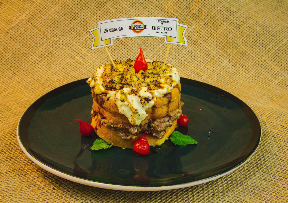 Pão de queijo recheado com charque acebolada na nata, coberto por uma farofa de queijos (coalho e manteiga), acompanhado de uma calda de rapadura com hortelã.