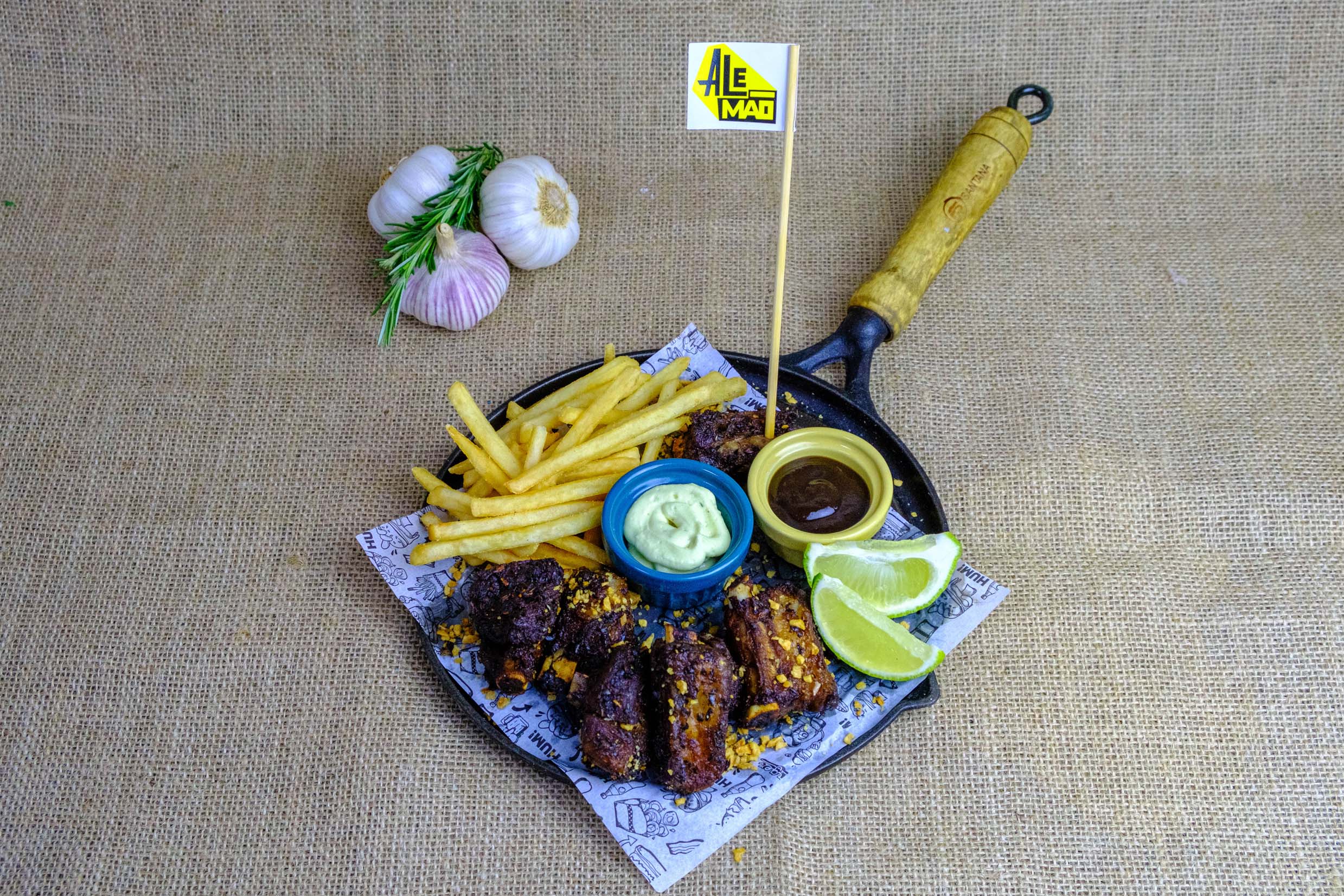 Costelinhas de porco acompanhadas com fritas, maionese caseira e barbecue.