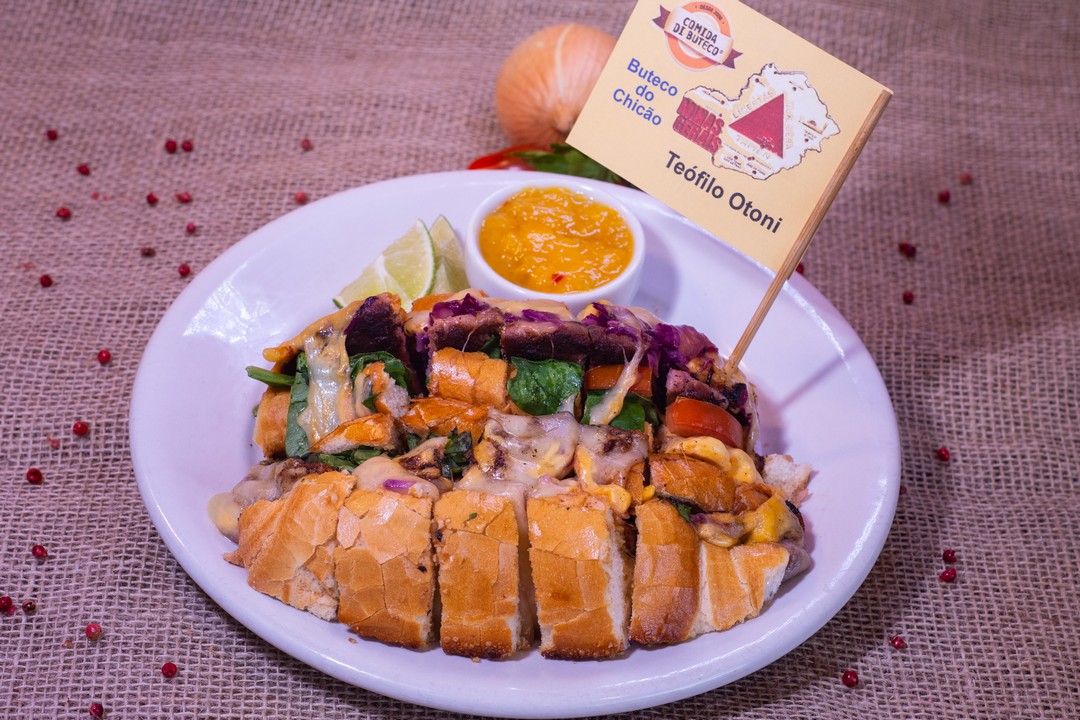 Pão francês com bife de linguiça caipira, repolho roxo, provolone e espinafre. Servido como boca de anjo, acompanhado de molho chutney.