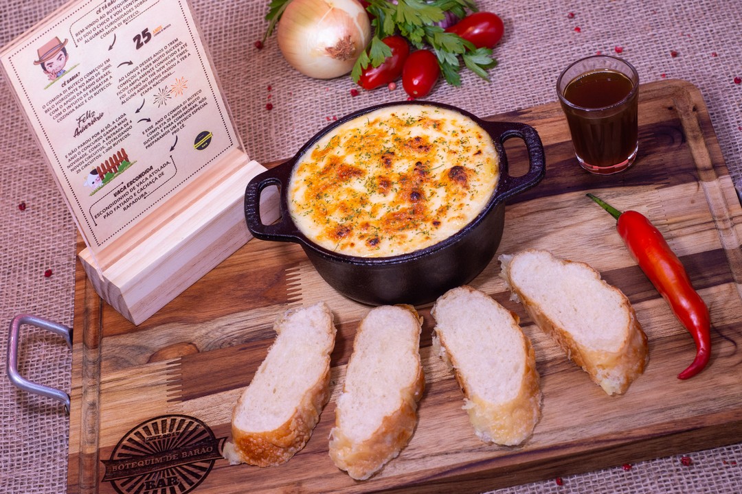Escondidinho de vaca atolada, acompanha pão fatiado e cachaça de rapadura.