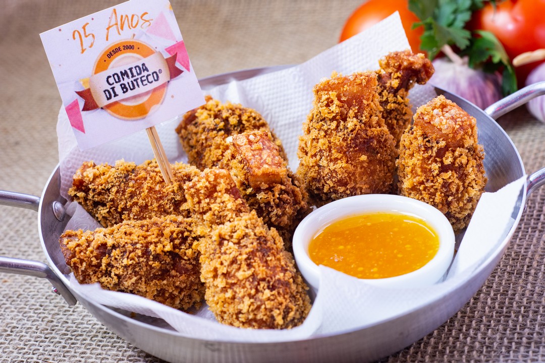 Bolinho de mandioca com pancetta e recheado com queijo muçarela. Acompanha uma geleia de maçã.