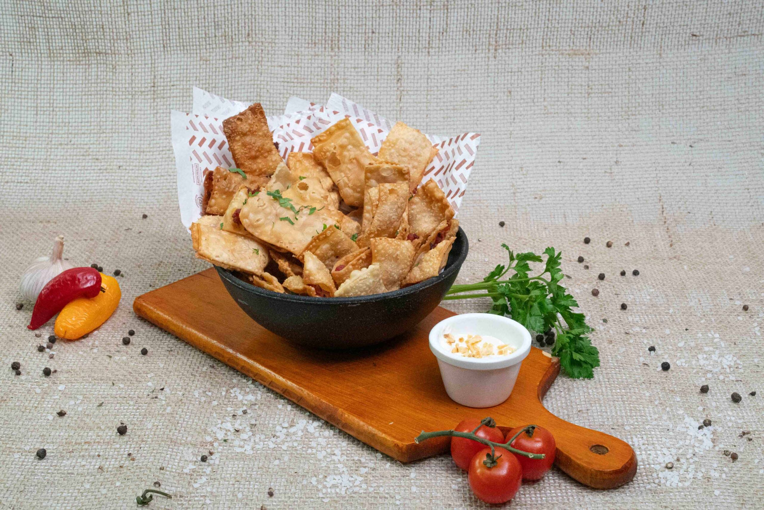 Massinha de pastel torcidinha com linguiça dobrada e frita. Acompanha requeijão com alho frito.