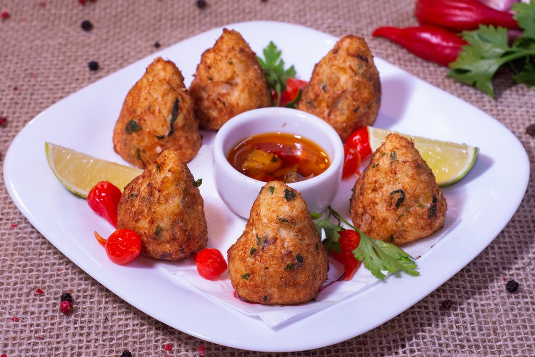 Coxinha recheada de bacalhau, acompanha pimenta da casa.
