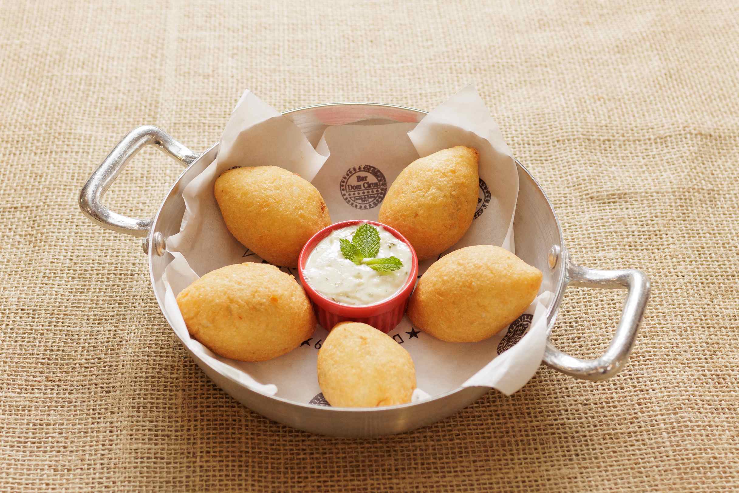 Bolinho de arroz recheado com carne de sol, banana-da-terra e amêndoas douradas na manteiga, e cheiro-verde. Acompanha molho da casa.