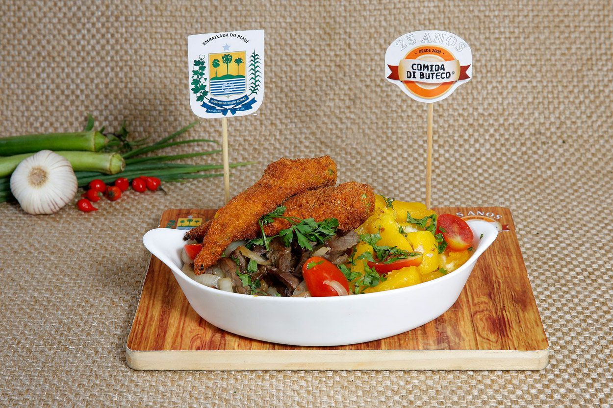 Mandioca cozida, carne de sol acebolada, quiabo frito e cheiro-verde.