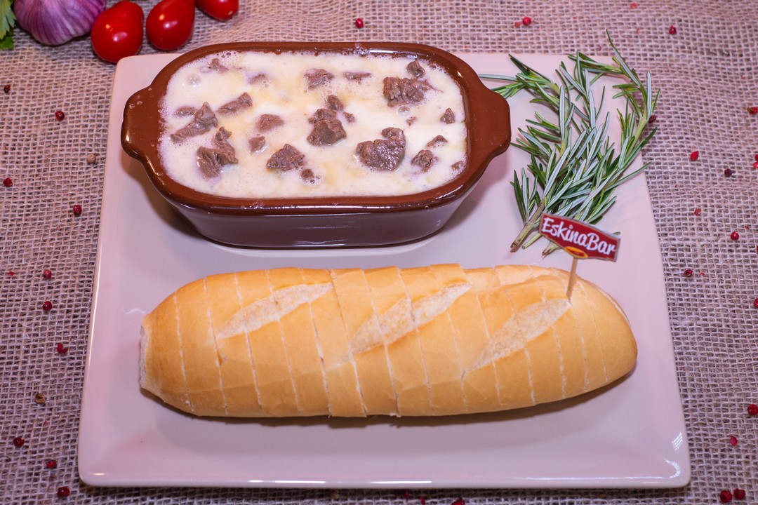 Cubos de filé-mignon grelhados na manteiga, cobertos com o molho de queijos do Eskina. Acompanha baguete.