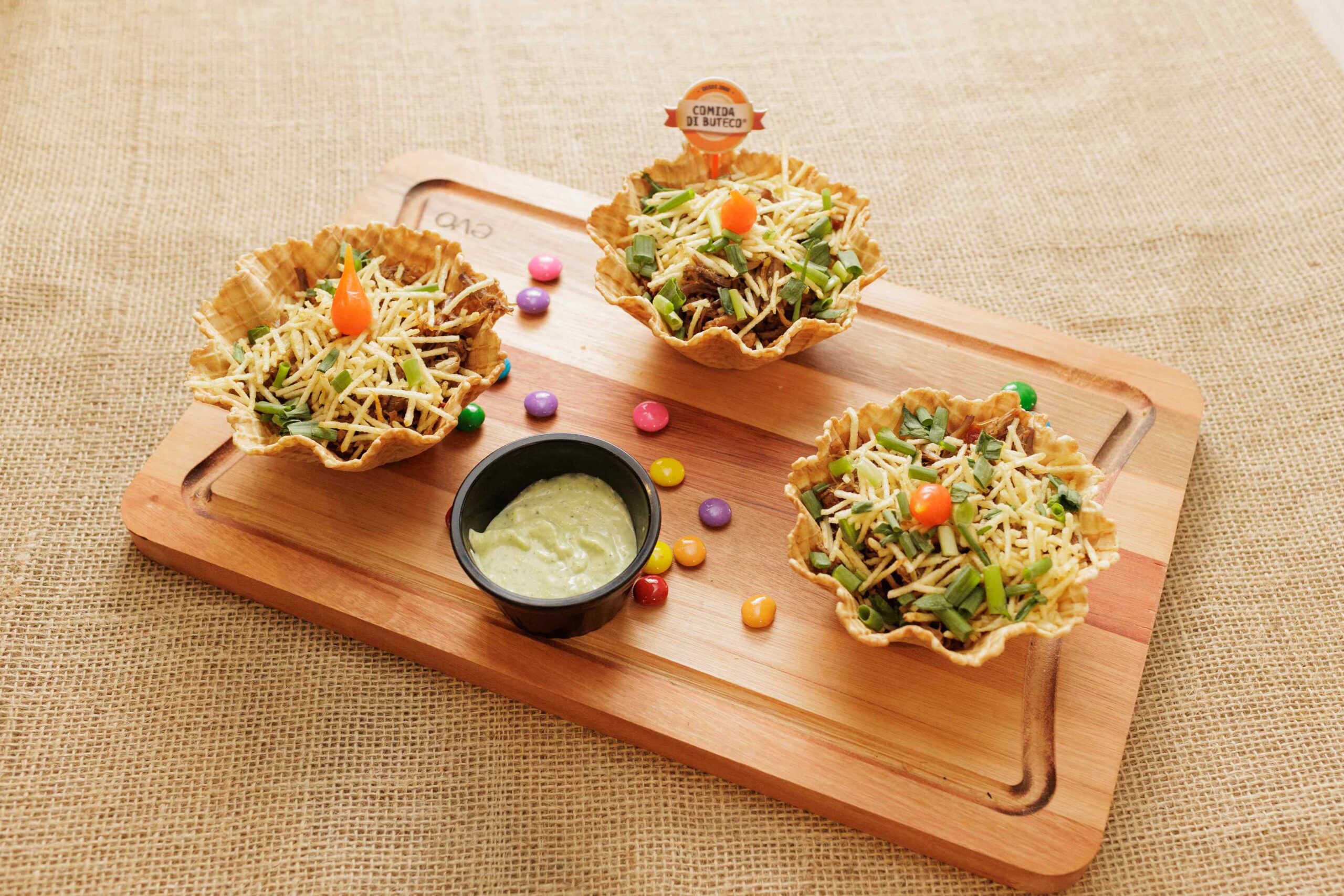 Carne de lagarto desfiada, temperada e servida em uma cestinha de sorvete crocante.