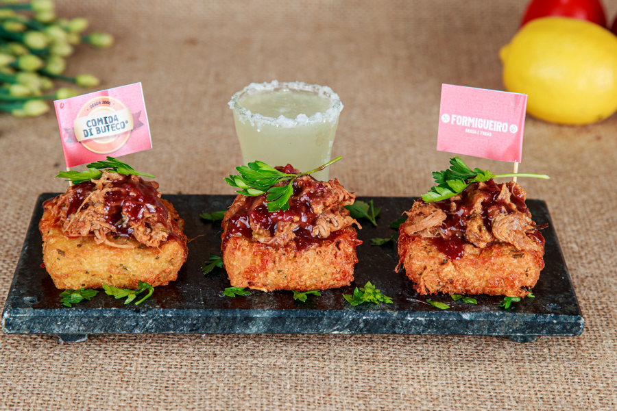Canapé de mandioca frito, com um ragu de cupim com cerveja preta em cima, finalizado com molho de açaí e pimenta-dedo-de-moça.