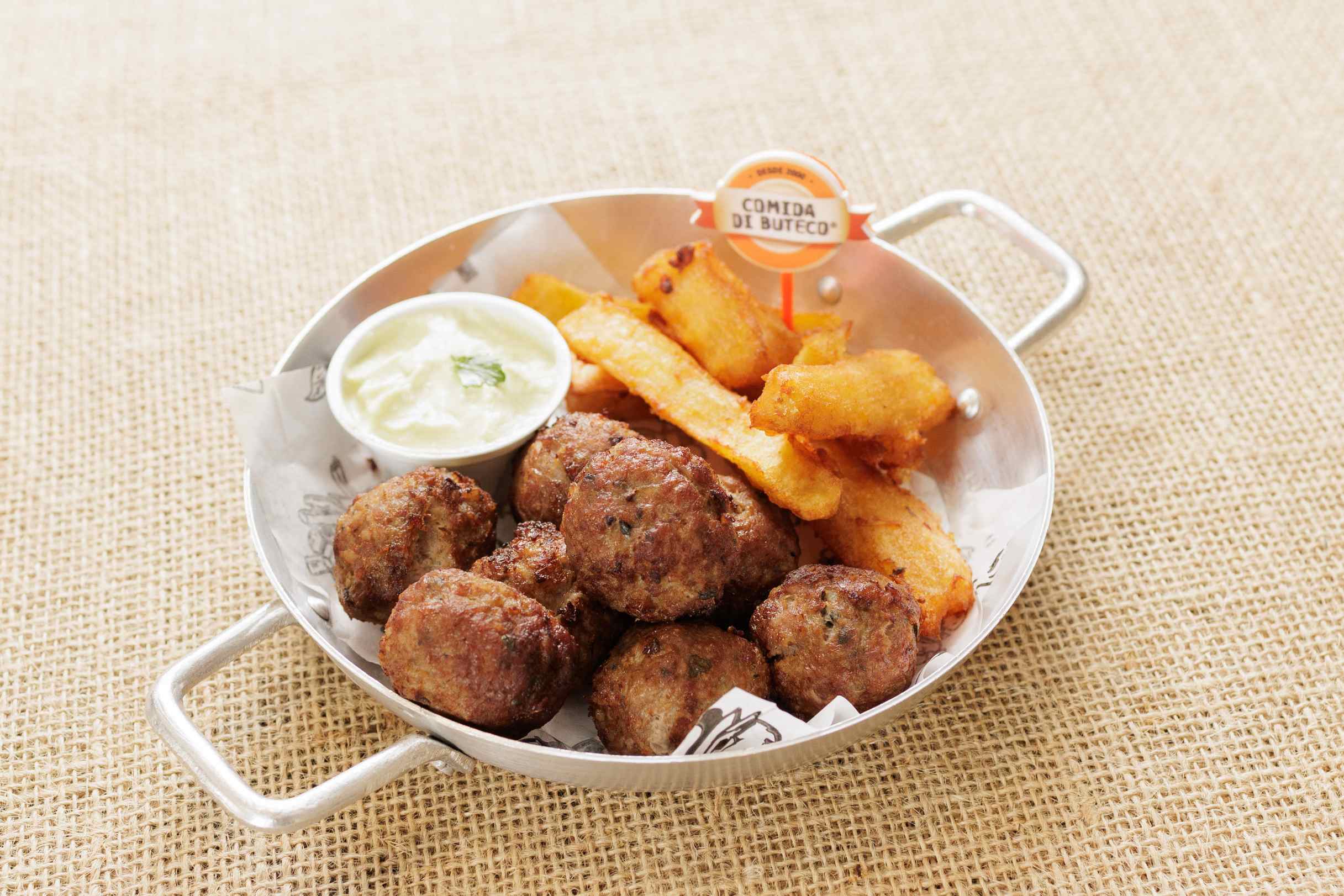 Bolotinhas de carne moída com cream cheese, muçarela e especiarias. Acompanha: mandioquinha e molho da casa.