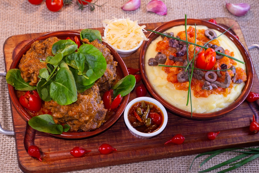 Rabada com polenta mole e molho napolitano com azeitona preta.