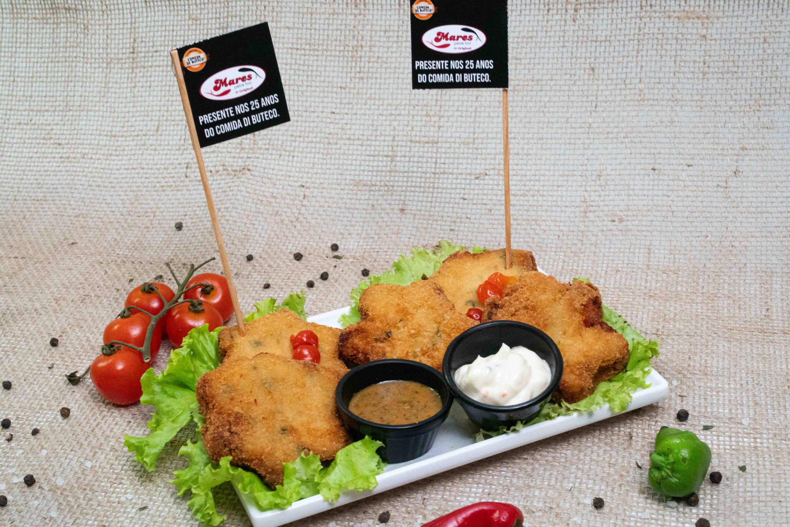 Bolinho de tilápia em formato de estrela com massa de batata. Acompanha molho de pimenta da casa e molho tártaro.