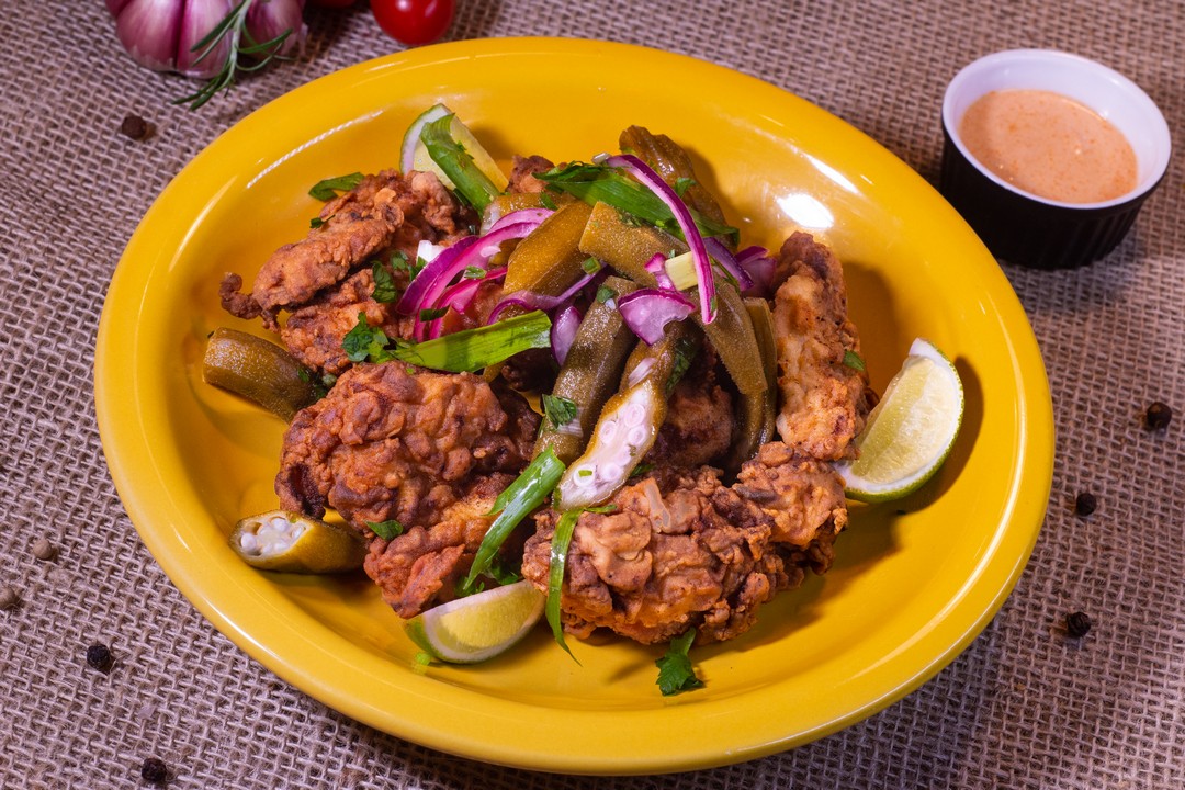 Frango com quiabo no jeito Mena Gastrobar, sobrecoxa desossada marinada e frita, picles de quiabo artesanal, servido com nosso molho picante secreto.