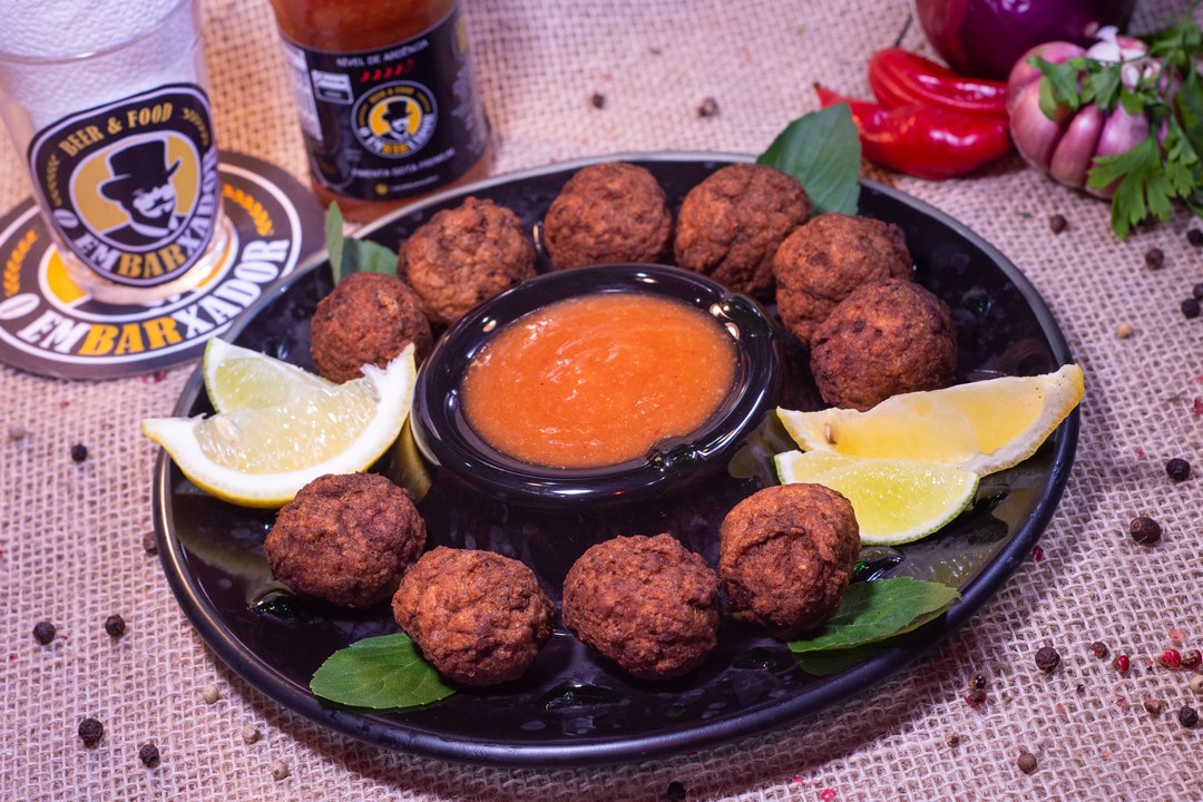 Porção de porpetas picantes acompanhadas de barbecue artesanal de goiaba.