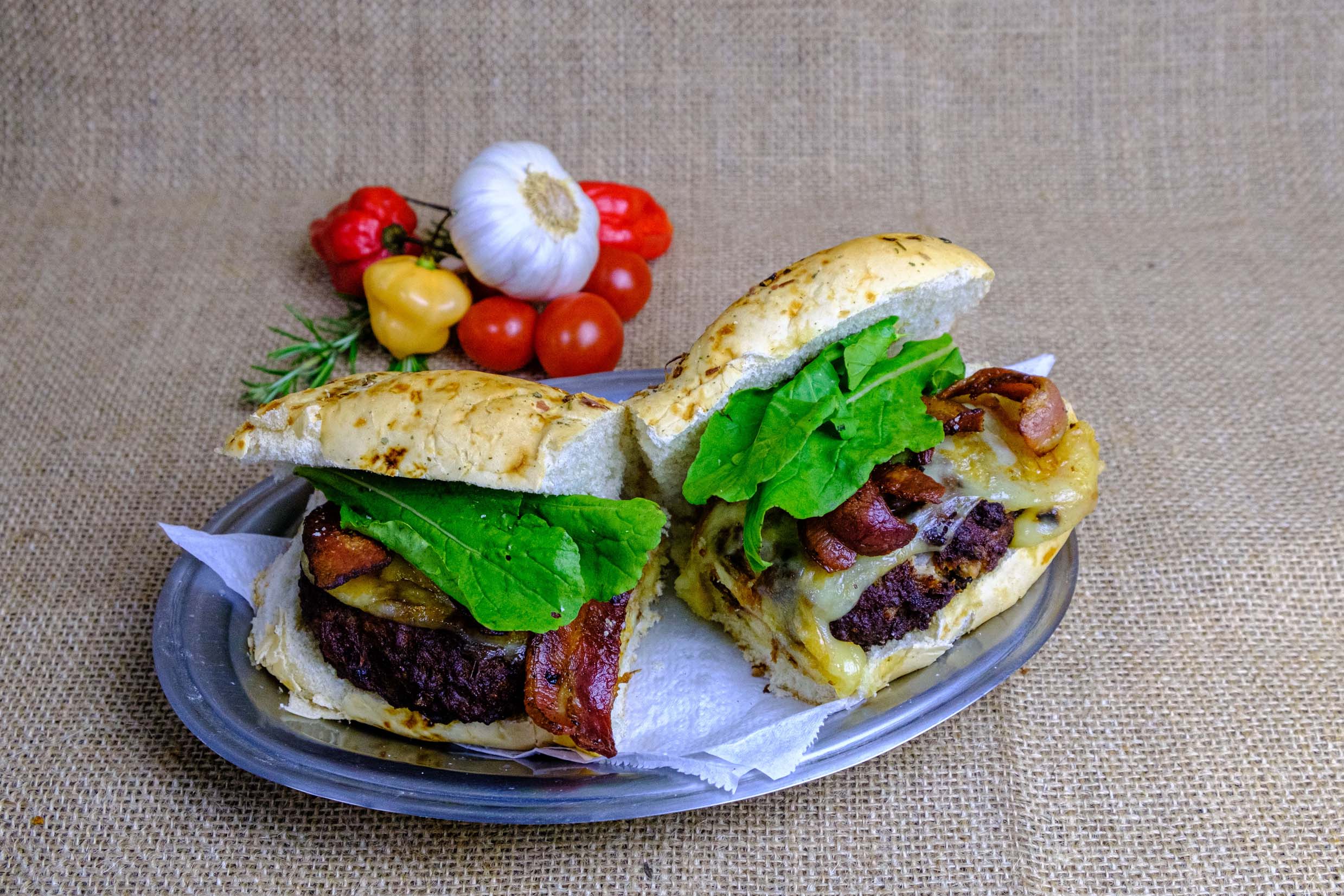 Sanduíche de pão baguete, com duas almôndegas, queijo, bacon crocante, rúcula e molho especial.