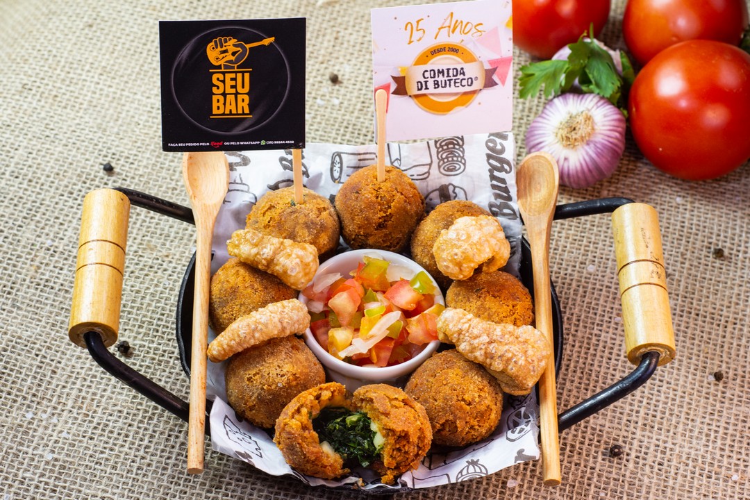 Bolinho de feijão-tropeiro, acompanhado de vinagrete.