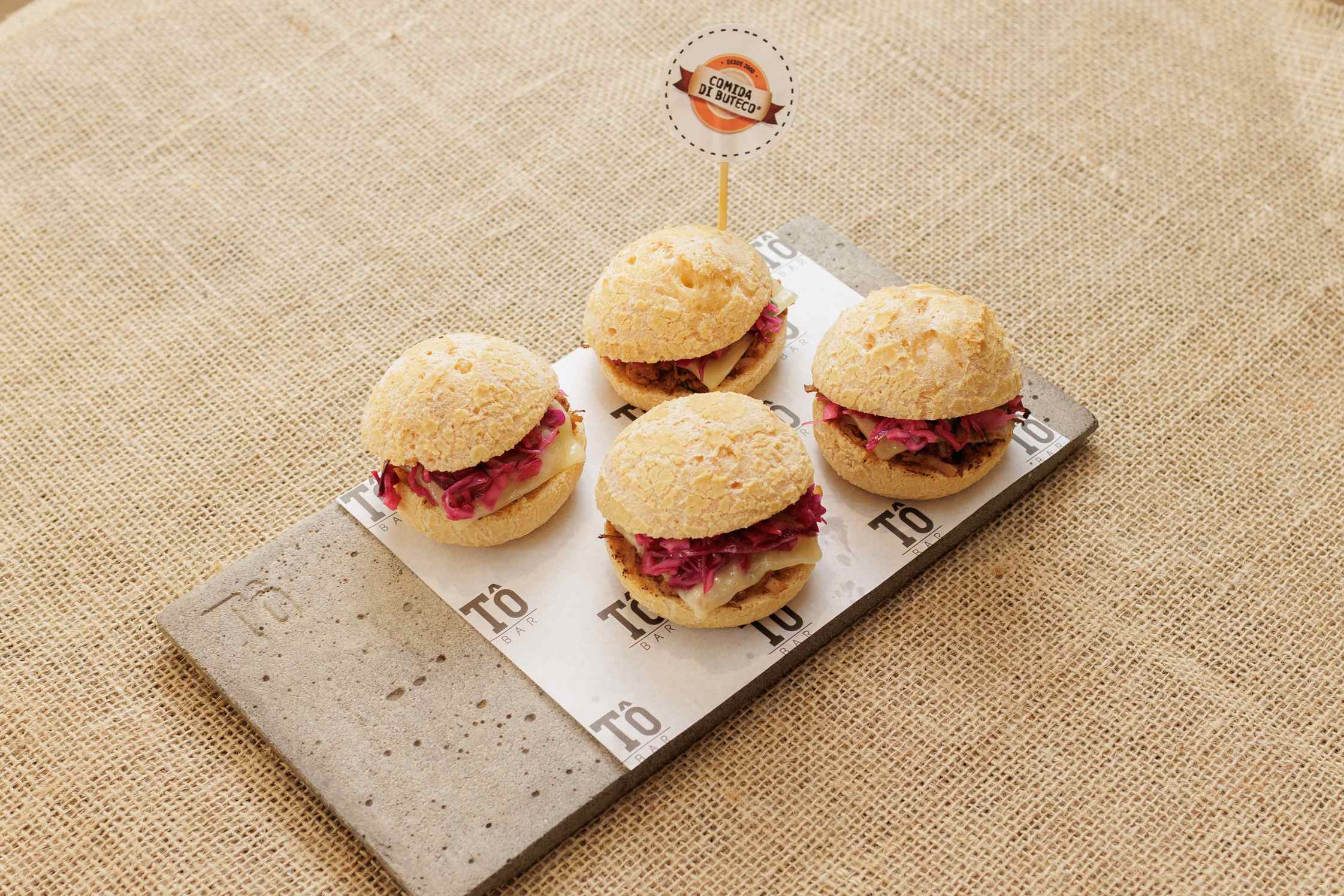 Pães de queijo caseiros recheados com pernil suíno desfiado, queijo da Canastra e vinagrete de repolho-roxo.