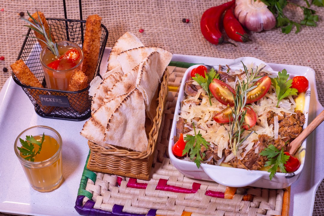 Cubinhos de fraldinha marinados no vinho e ervas finas, flambados na cachaça mineira com creme de mandioquinha, servidos com torradinhas de pão árabe. Acompanha 4 palitinhos de tapioca com queijo com geleia da casa e shot de cachaça bland.