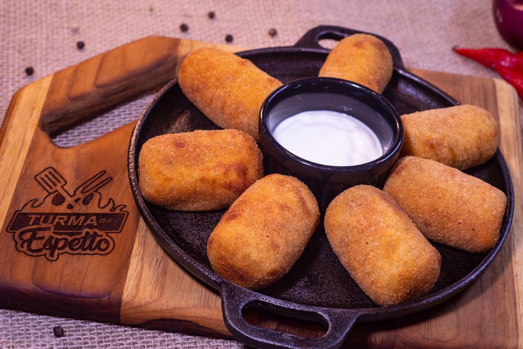 6 bolinhos de massa de mandioca recheados com carne-seca. Acompanha molho de maionese temperado com alho.