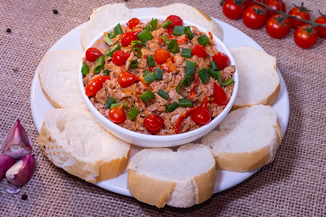 Filé-mignon suíno marinado em ervas finas por 12 horas e assado em fogo baixo. Servido com molho de tomate, cebola e pimentão.