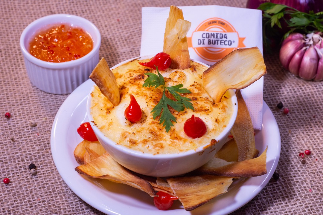 Escondidinho de cupim com Catupiry, purê de mandioca e chips de mandioca. Acompanha geleia de pimenta.