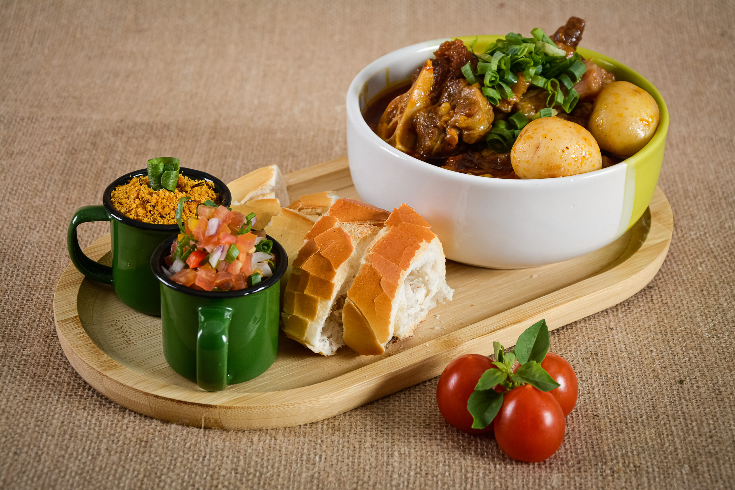 rabada ensopada, servido com batata bolinha. Acompanhada de farofa de torresmo e vinagrete de agrião.